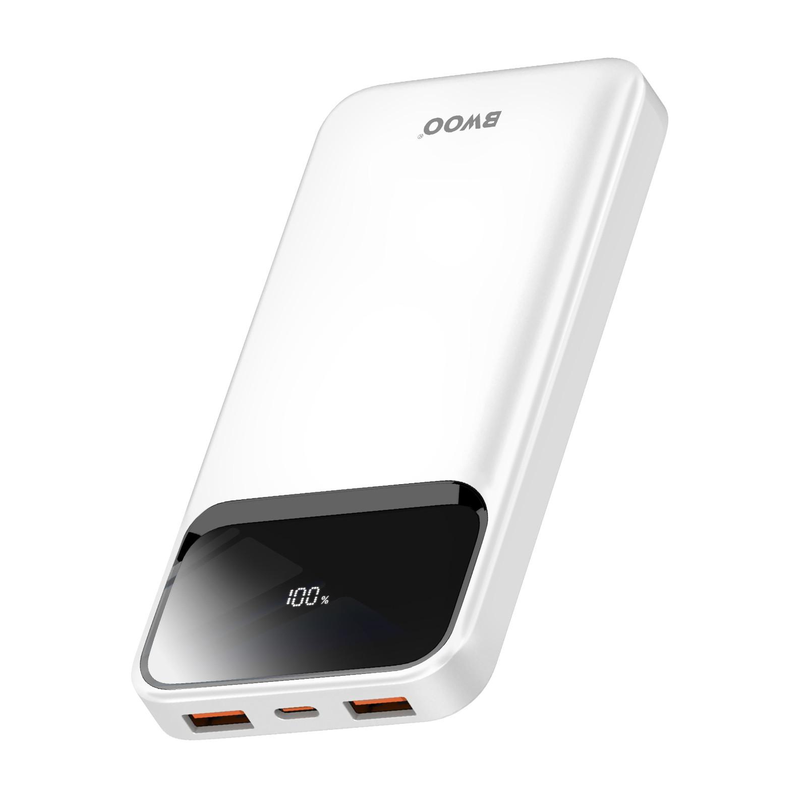 Batterie externe d'une capacité de 10000mAh de Bwoo. Charge rapide 22.5W. 3 ports : 2 USB + 1 USB-C. Compatible Power Delivery et Quick Charge. Affichage numérique du niveau de charge. Format compact : 146 x 68 x 16mm. Poids léger : 237 g. Compatibilité large : smartphones, tablettes, écouteurs, GPS, montres, etc.