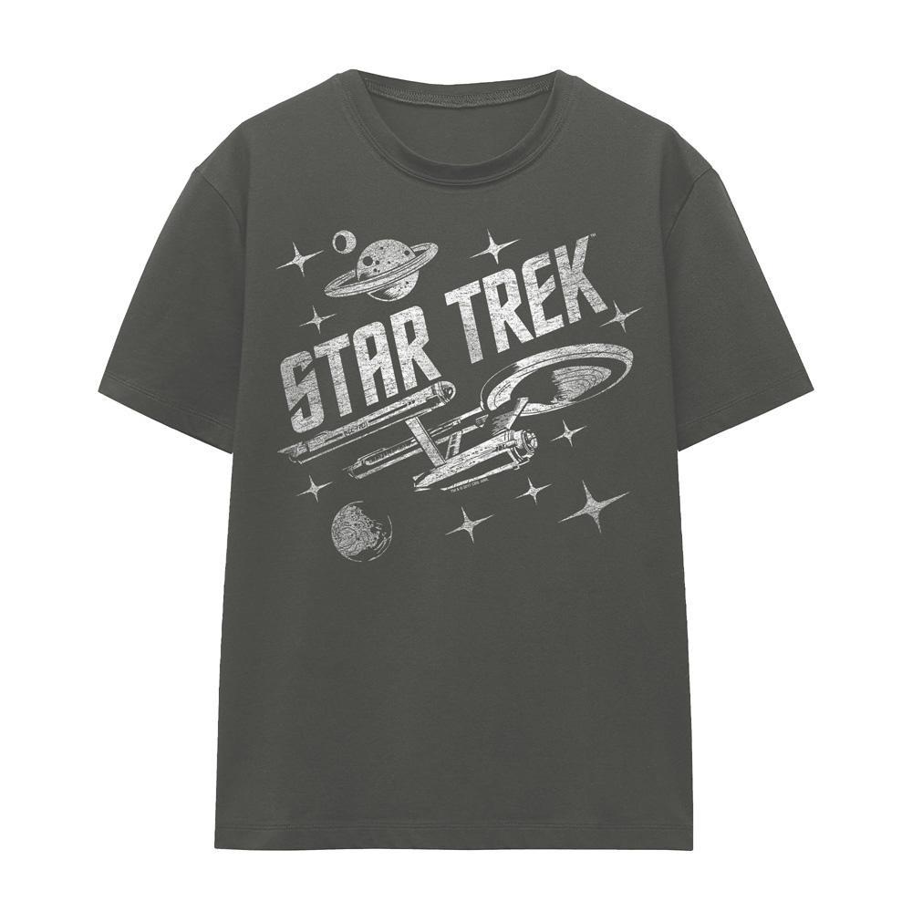 Ce T-shirt présente un col rond classique et des manches courtes, offrant une coupe confortable et polyvalente pour un usage quotidien. Le devant est orné d'un imprimé graphique vieilli inspiré de Star Trek, mettant en valeur des éléments emblématiques tels que l'USS Enterprise, des planètes et des étoiles, ainsi que le logo audacieux "STAR TREK".