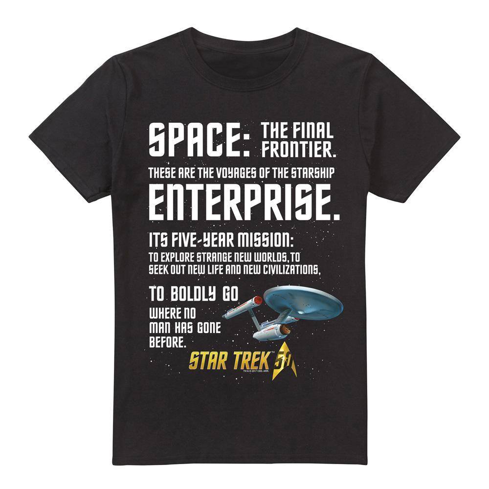 Ce T-shirt présente un col rond classique et des manches courtes, offrant une coupe confortable et polyvalente. Le devant est orné d'un imprimé graphique inspiré de la série emblématique Star Trek, mettant en vedette le célèbre monologue d'introduction et l'Enterprise. Ce T-shirt est un excellent moyen d'exprimer son appréciation pour la franchise de science-fiction tant aimée.
