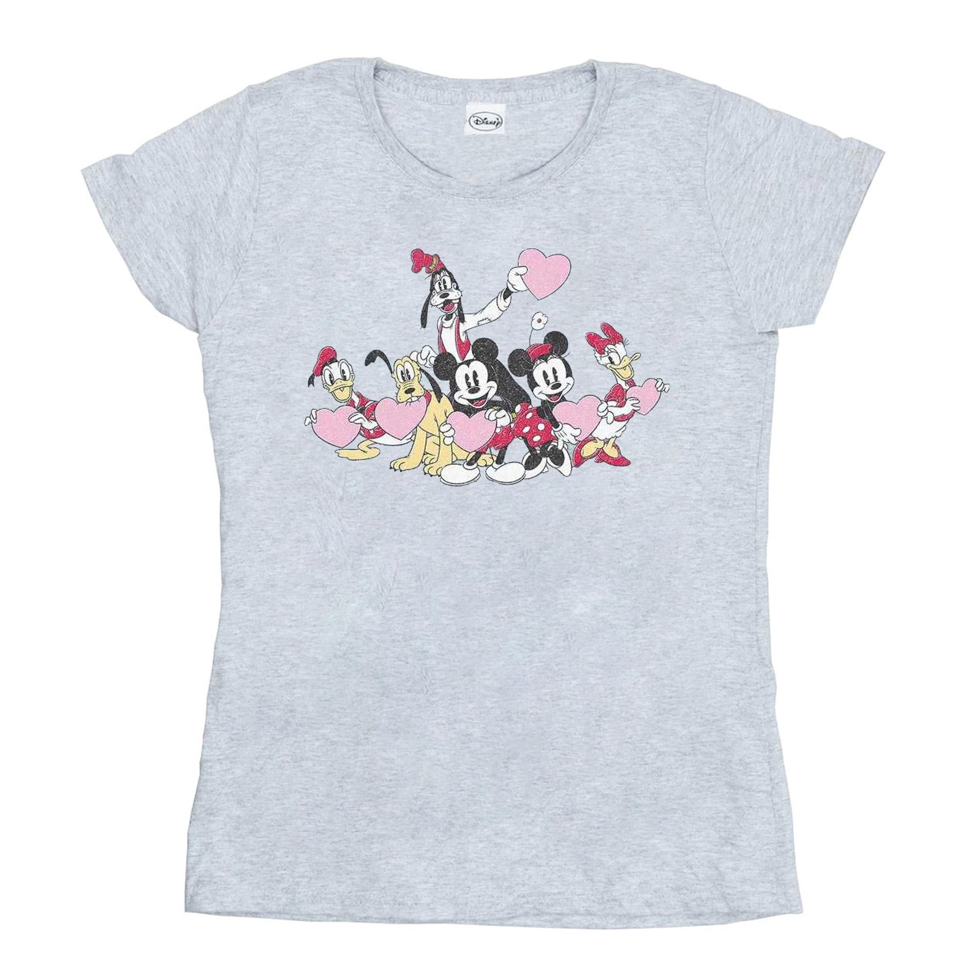 Ce T-shirt présente un charmant imprimé graphique de personnages Disney adorés, notamment Mickey Mouse, Minnie Mouse, Donald Duck, Daisy Duck, Goofy et Pluto, tous tenant des cœurs roses. Le col ras-du-cou classique et les manches courtes en font un ajout polyvalent à toute garde-robe décontractée.