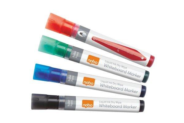 Tintenmarker, trocken abwischbar Trocken abwischbare Marker für Flüssigtinte zur Verwendung mit trocken abwischbaren Nobo Whiteboards und mit Nobo Flipchart-Blöcken Kräftige, leuchtende und auch aus der Distanz gut sichtbare Farben Pumpstift für besseren Tintenfluss und klare Linien Standardspitze für starke, breite Linien und klare, leicht lesbare Schrift Sichtfenster zum Ablesen des Füllstandes