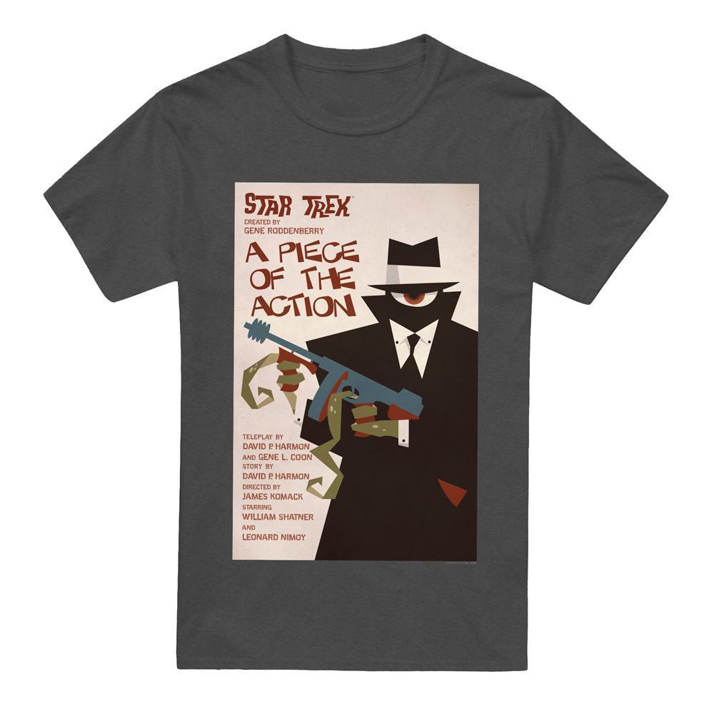 Ce T-shirt présente un imprimé graphique inspiré de "Star Trek: A Piece of the Action", un épisode de la série originale. Le design met en scène une figure stylisée avec un fedora et un trench-coat, tenant une arme, sur un fond de style vintage avec les crédits de l'épisode. Il est sous licence officielle et offre une coupe régulière.