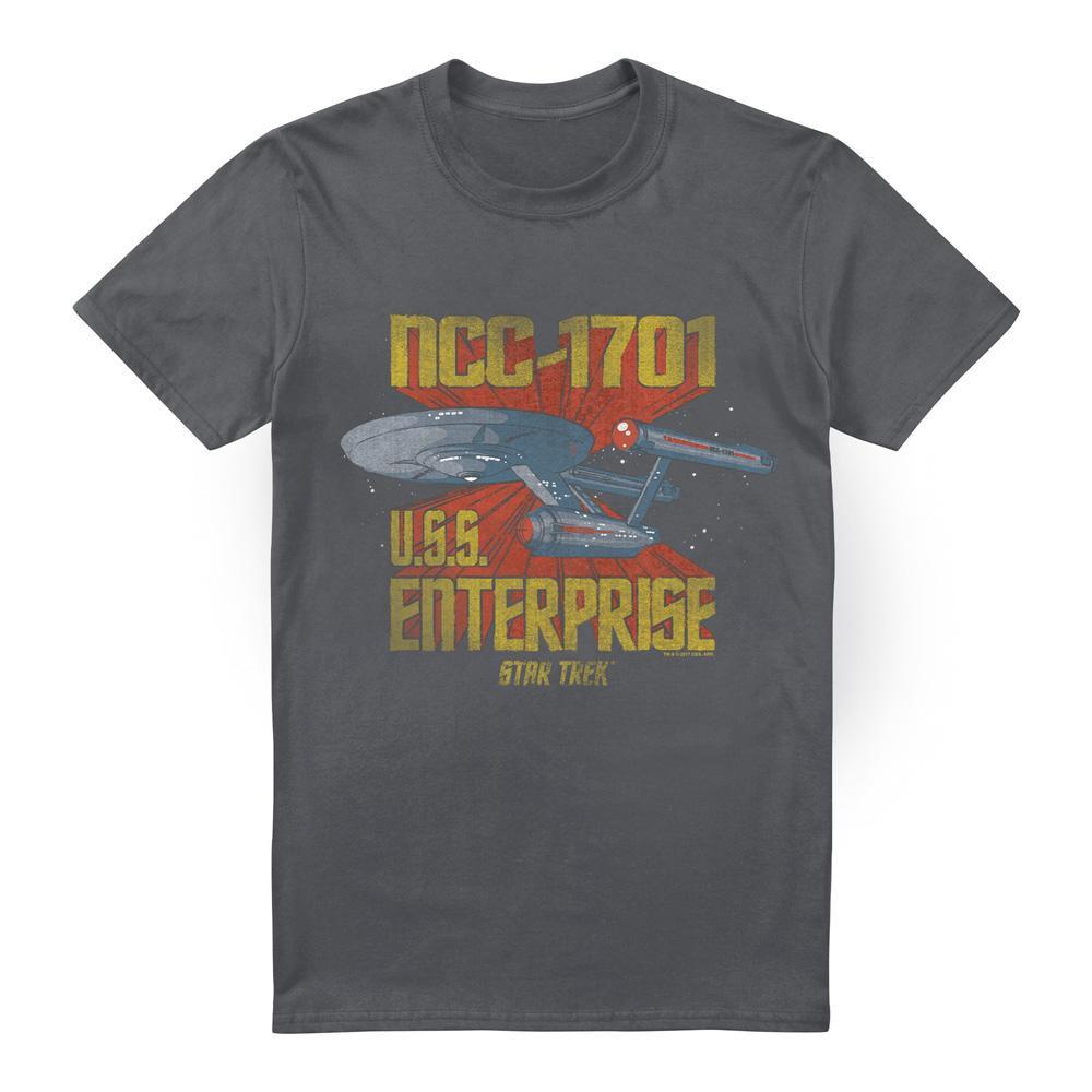 Ce T-shirt présente un imprimé graphique de l'USS Enterprise NCC-1701 de Star Trek. Le design est vieilli pour un look vintage, sur un fond sombre.
