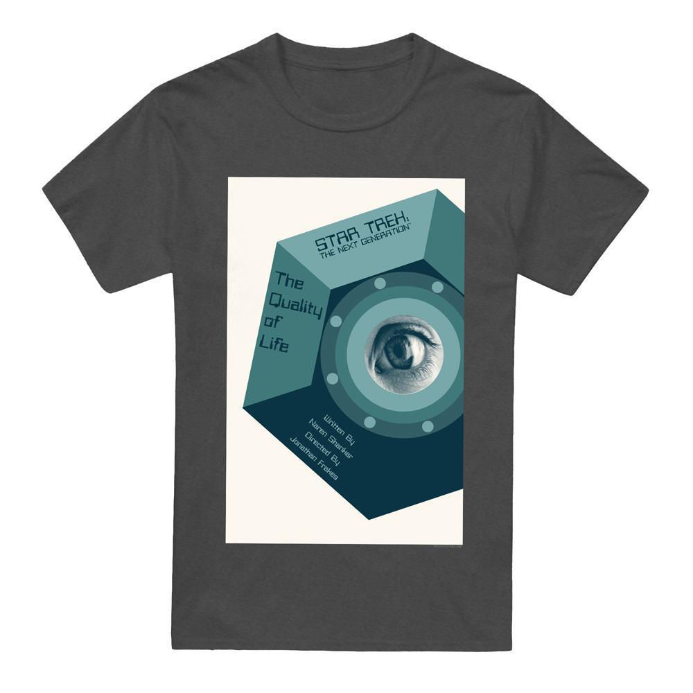 Ce T-shirt présente un imprimé graphique inspiré de "Star Trek: The Next Generation" Saison 6 Épisode 9, intitulé "The Quality of Life". Le design met en valeur un motif géométrique stylisé avec un œil en son centre, ainsi que le titre de l'épisode et les crédits pour l'auteur et le réalisateur. Ce produit sous licence officielle est fabriqué à partir d'un mélange de polyester et de coton.