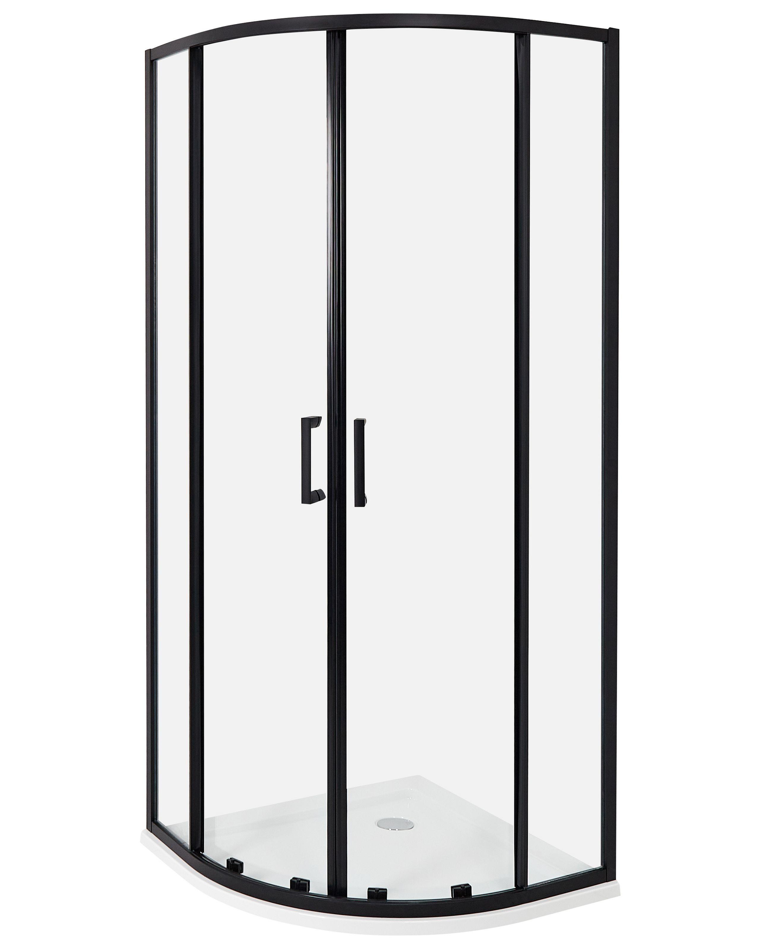 Douche demi-ronde avec double porte coulissante. Prenez soin de votre salle de bain en l'équipant de cette cabine de douche. Dotée d'une double porte coulissante, elle est certaine de ne pas laisser couler d'eau sur les carreaux de votre salle de bains. Fabriquée en verre trempé de haute qualité, cette pièce durera de nombreuses années, même sans entretien quotidien. Le cadre noir, fabriqué en aluminium, protège également le produit des dommages, tout en mettant en valeur le design moderne.