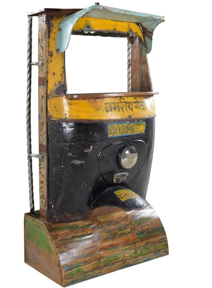 Tours de ville à travers les rues du Vietnam, odeurs envoûtantes des multiples stands de street food et découverte de la culture asiatique - avec cette armoire-bar fabriquée à partir d'un tuk tuk recyclé, c'est un peu de vacances asiatiques qui s'invite à la maison. Le terme "tuk tuk" désigne de petits pousse-pousse utilisés en Asie pour le transport de personnes et de marchandises. Ces véhicules rustiques doivent leur nom au bruit typique des moteurs à deux temps utilisés autrefois. La façade métallique noire et jaune de l'armoire-bar rappelle les taxis connus des métropoles du monde entier. L'avant du tuk tuk est combiné avec du vieux bois laqué multicolore. L'arrière cache une armoire-bar entièrement équipée avec des supports pour six verres à pied, deux tiroirs et des étagères pour dix bouteilles. L'ancienne vitre avant sert de passe-plat. Cette armoire de bar est le complément idéal pour des concepts d'aménagement originaux dans le style usine chic moderne et attirera à coup sûr tous les regards comme bar d'intérieur ou dans une ambiance gastronomique cool.