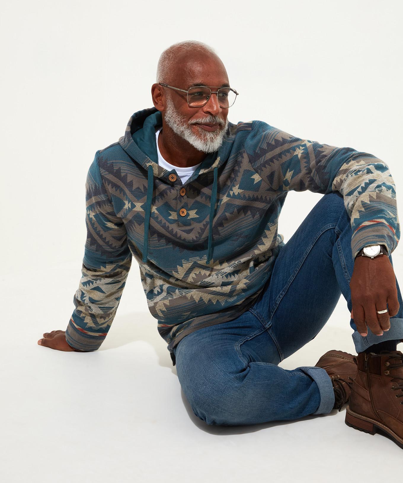 Ce haut à capuche unique tissé de manière artisanale présente un motif distinctif sur l'ensemble, offrant un mélange de confort et de style. Le design comprend une capuche avec des cordons de serrage ajustables et une patte de boutonnage partielle à l'encolure, offrant une polyvalence de port. Les poignets et l'ourlet côtelés assurent un ajustement parfait, ce qui en fait un ajout pratique à toute garde-robe.