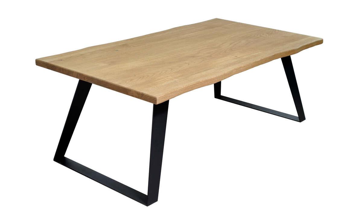 Table basse avec pieds coniques en métal, plateau en chêne sauvage huilé 25mm, métal époxy noir 4mm, 110 x 60 x 40 cm