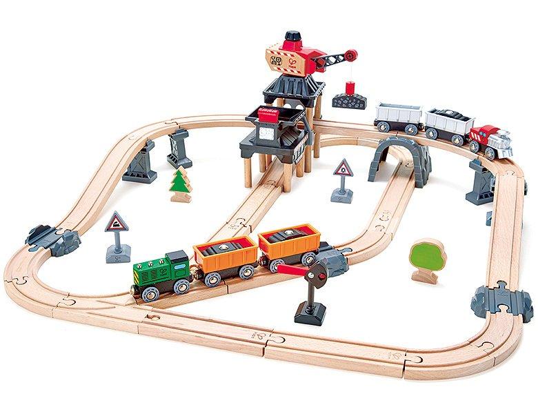 Dieses umfassende Set bietet ein authentisches und unterhaltsames Spielerlebnis für kleine Eisenbahnfans. Mit insgesamt 64 Teilen ermöglicht es kreatives Spiel mit einem Magnetkran, zwei Loks und vier Waggons. Die hochwertigen Holzschienen schaffen eine realistische Kulisse. Verkehrsschilder und Naturmotive ergänzen das Set. Ideal für die Entwicklung von Hand-Augen-Koordination und Kreativität.