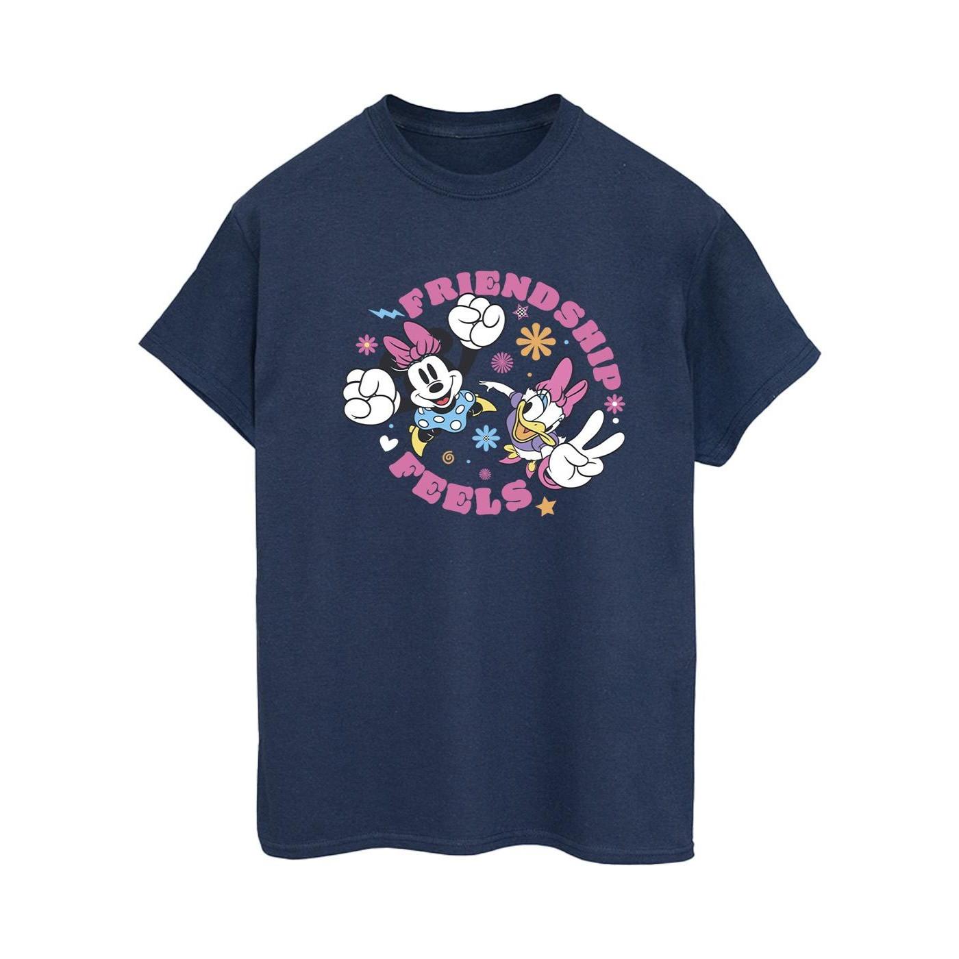Ce T-shirt présente un imprimé graphique vibrant de Minnie Mouse et Daisy Duck, célébrant l'amitié avec le texte « FRIENDSHIP FEELS ». Le col rond classique et les manches courtes en font un ajout confortable et polyvalent à toute garde-robe décontractée.