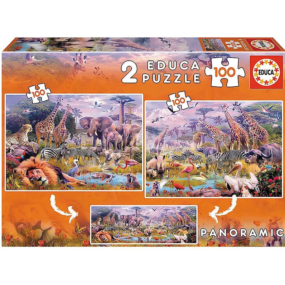 Entdecken Sie die faszinierende Tierwelt mit diesem Doppel-Puzzle, das zwei farbenfrohe Panoramabilder bietet. Jedes Puzzle besteht aus 100 Teilen und hat eine Gesamtgrösse von 80x28 cm. Dieses Spiel fördert Ihre Konzentration und Kreativität, während Sie die einzelnen Tierarten und ihre Lebensräume erkunden.