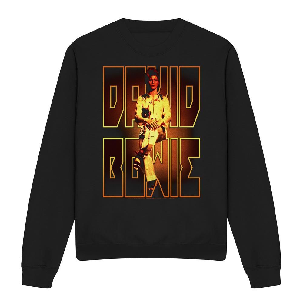 Ce sweatshirt présente un imprimé graphique saisissant de David Bowie, ce qui en fait une pièce remarquable pour tout fan. Le design capture une pose classique, sur une interprétation audacieuse et stylisée de son nom.
