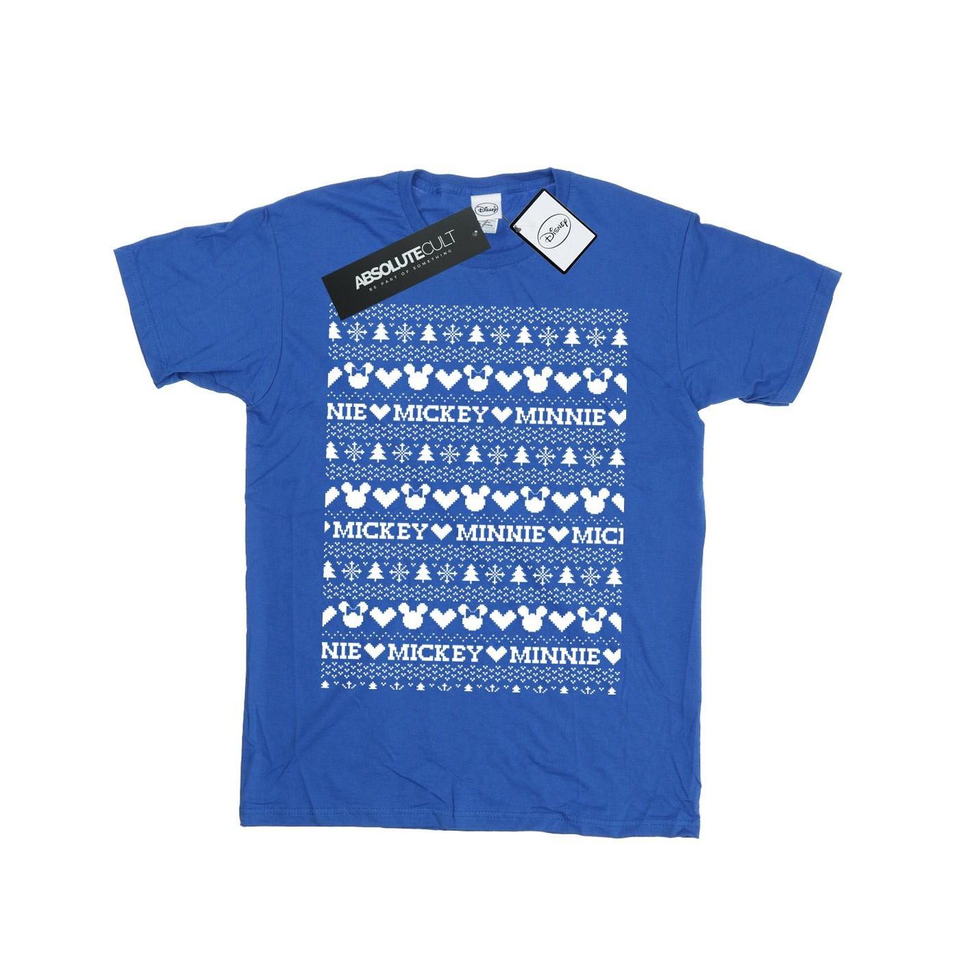 Ce T-shirt présente un imprimé festif de style pull de Noël avec Mickey et Minnie Mouse. Le design comprend des flocons de neige, des sapins de Noël et les noms "Mickey" et "Minnie" entrelacés avec des symboles de cœur, créant un look ludique et festif. Il est fabriqué dans un tissu de poids moyen et a une coupe régulière.