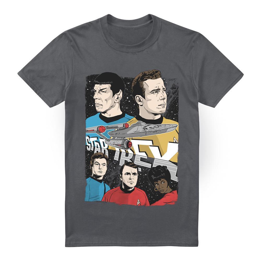 Ce t-shirt à manches courtes présente un col rond classique et un imprimé graphique. Le design met en scène des personnages emblématiques et l'USS Enterprise, sur fond étoilé, ce qui en fait une pièce distinctive pour les fans.