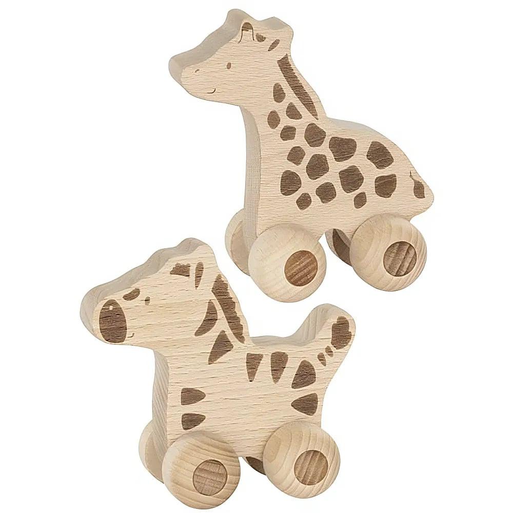 Die Schiebetiere aus der Nature-Linie sind aus hochwertigem Holz gefertigt und bieten ein natürliches Spielerlebnis. Sie kommen ohne Farben aus, ihre ansprechenden Brauntöne entstehen durch eine spezielle thermische Behandlung. Die stabilen, runden Räder sorgen für ein leichtes und sicheres Schieben. Die zwei Figuren haben eine Grösse von 10,5 x 5,7 x 11,5 cm und sind ideal für kleine Hände.