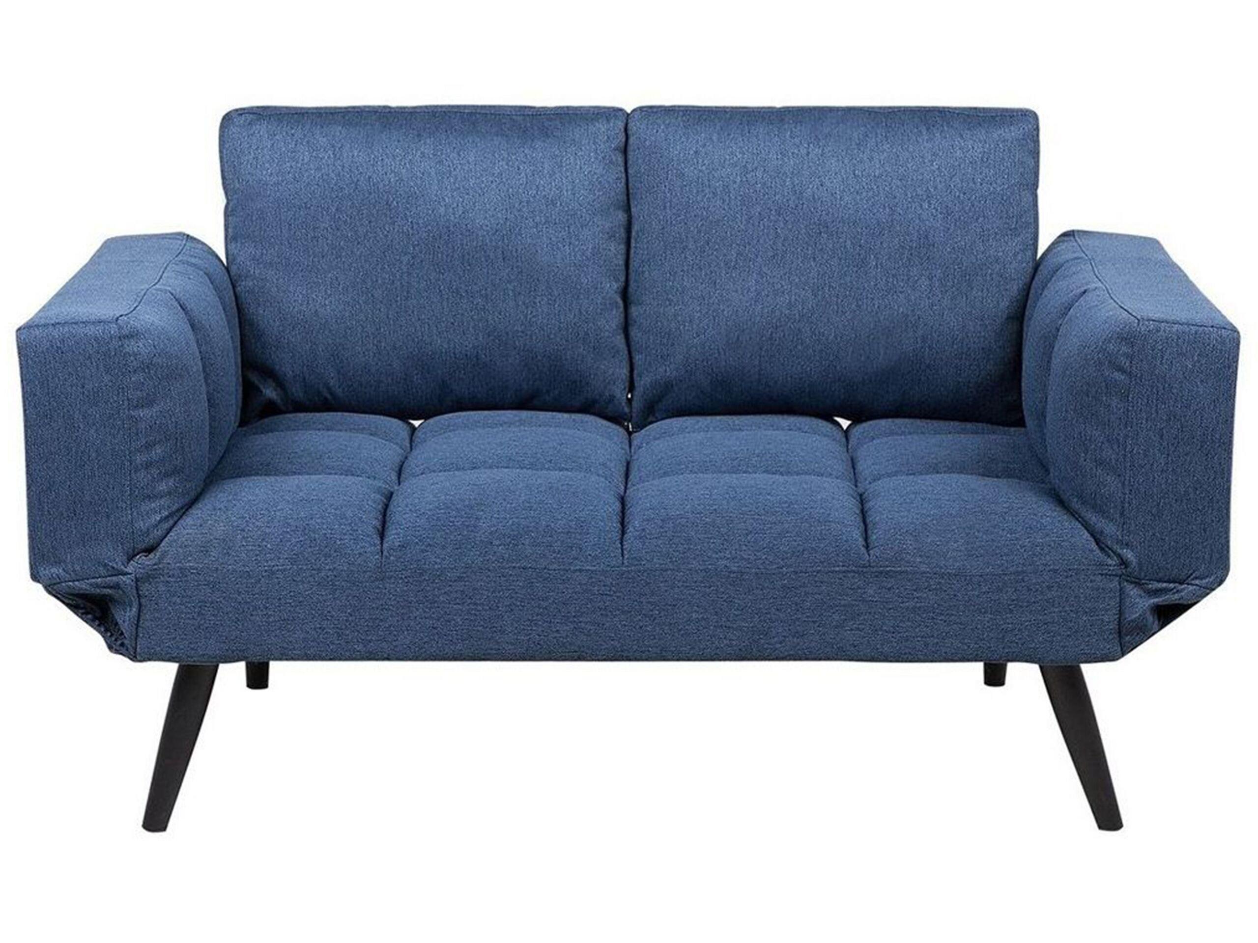 Petit canapé-lit bleu marine au style rétro . Ce canapé moderne trouvera sa place dans des espaces limités grâce à ses dimensions réduites. L’assise galbée et le dossier épais se marient parfaitement avec des lignes épurées et les hauts pieds noirs. Le canapé se transforme en canapé-lit en quelques secondes, tandis que les accoudoirs réglables peuvent être pliés pour former un espace supplémentaire. L’élégance et le confort dans un même ensemble.