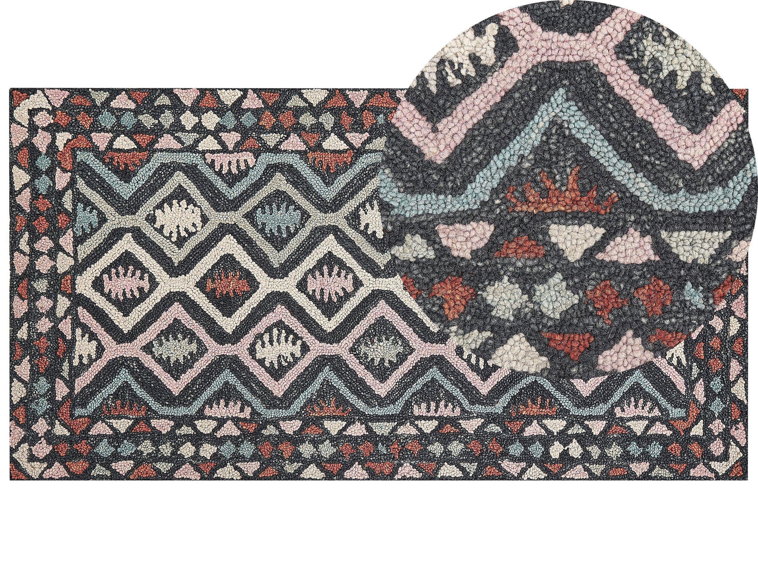Tapis multicolore avec motif oriental. Ajoutez une touche unique à votre intérieur avec un tapis exceptionnel qui ne manquera pas d'attirer l'attention de vos invités. Cette pièce de décoration originale, avec son motif coloré géométrique, complétera joliment tout intérieur moderne ou bohème. Le produit est touffeté à la main à partir de fibres de laine de haute qualité.