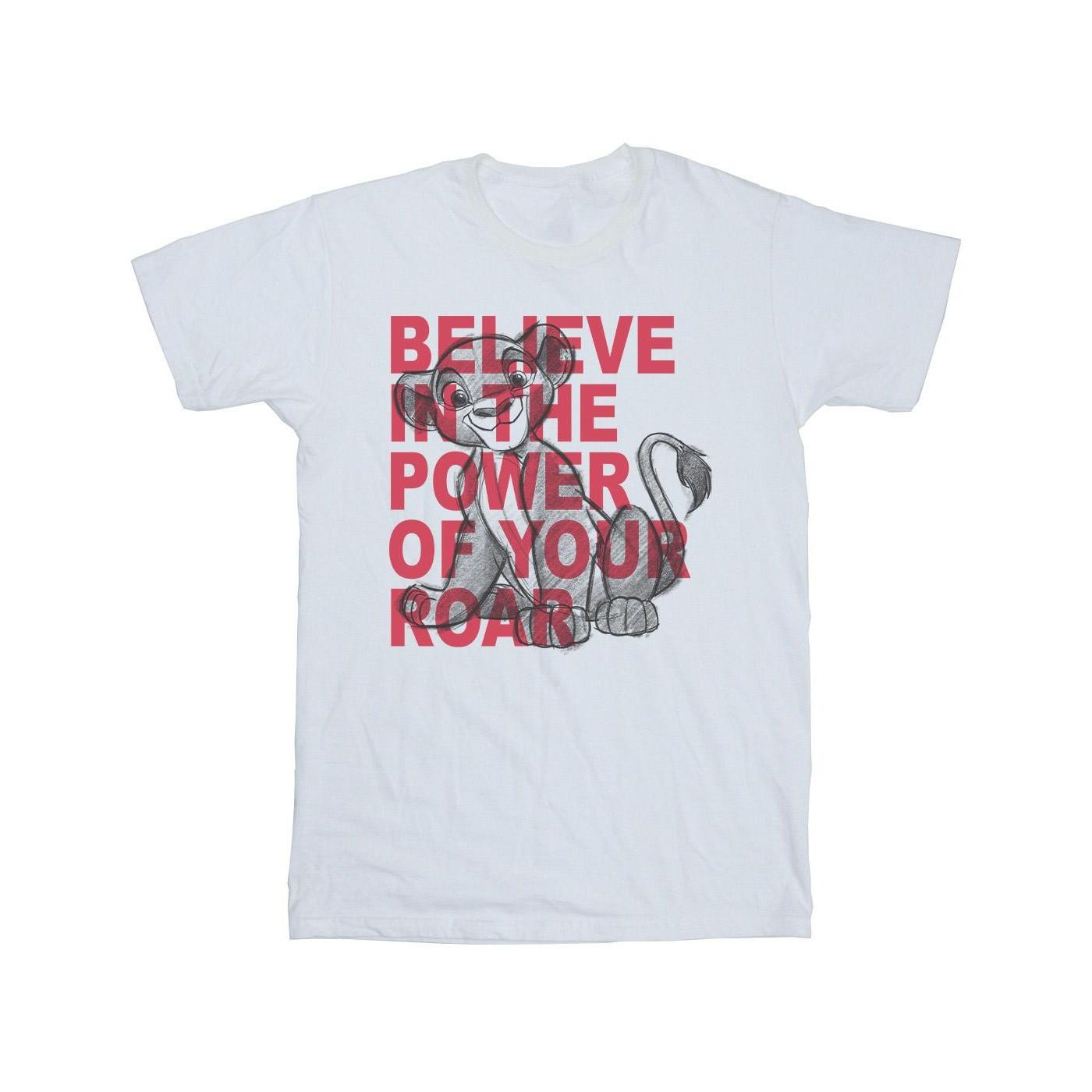 Ce T-shirt présente un imprimé graphique inspiré du Roi Lion de Disney. Le design met en scène un jeune Simba avec le texte « BELIEVE IN THE POWER OF YOUR ROAR » en lettres rouges audacieuses, ce qui en fait une pièce distinctive pour les fans.