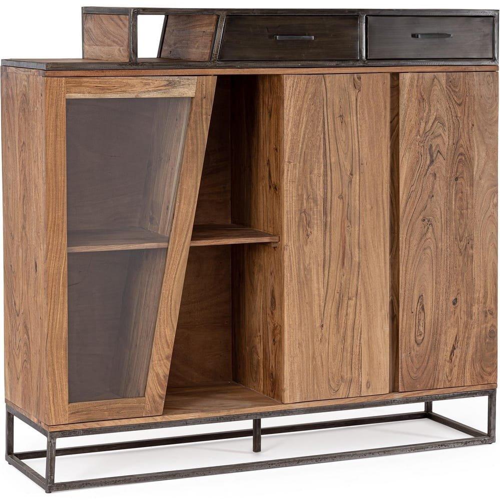 Highboard en bois d'acacia, MDF et acier, couleur naturelle, 145 x 40 x 134h cmStructure en bois d'acacia et acier revêtu par poudre époxyDossier en bois stratifiéFinition acrylique protectriceTiroirs et poignées en acierCompartiment de porte avec étagère