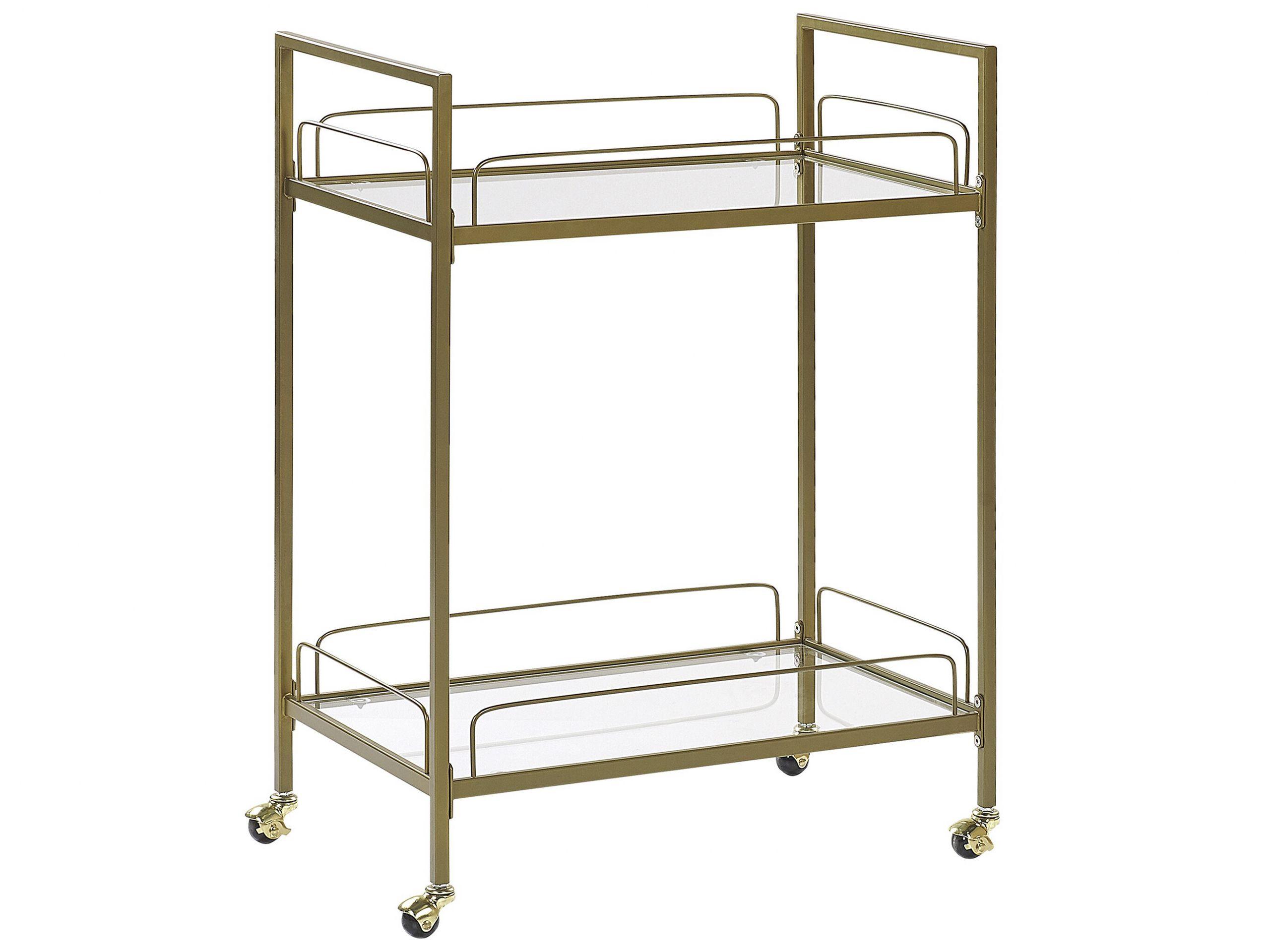 Desserte dorée en verre et métal avec roulettes pratiques. Si vous êtes à la recherche d'un meuble facile à déplacer, multifonctionnel et décoratif à la fois, cette desserte design fera votre bonheur. Doté de roulettes intégrées et de 2 étagères spacieuses, ce joli chariot est un meuble d'appoint ultra pratique dont vous pouvez vous servir aussi bien dans votre cuisine que dans votre salon. Il se transformera facilement en un bout de canapé dans votre séjour, en une petite console dans votre couloir, ou encore en une armoire supplémentaire dans votre cuisine. Côté style, cette cette superbe desserte présente un design moderne et glamour qui rafraîchira chaque intérieur contemporain.