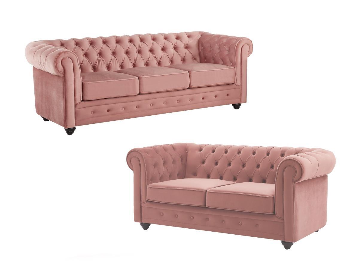 Vente-unique, Canapés 3 places et 2 places en velours rose pastel CHESTERFIELD