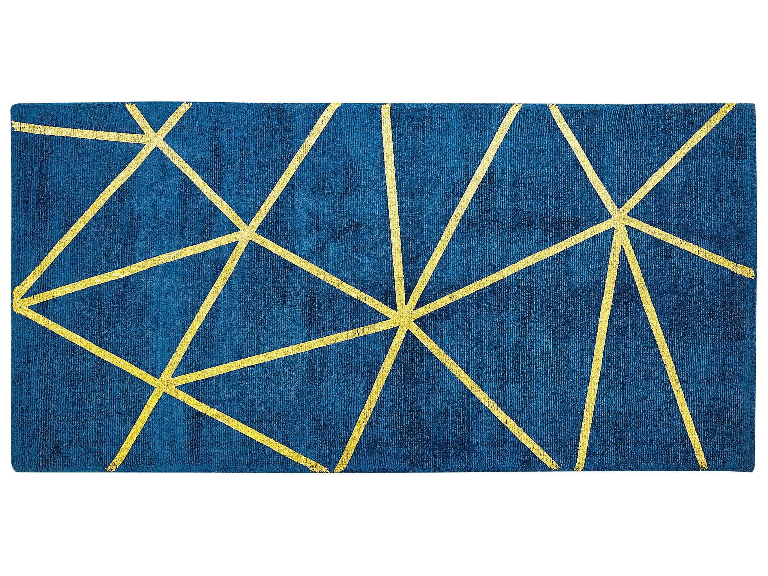 Tapis ultra doux en soie artificielle bleu marine avec motif doré . Décorez votre salon ou votre chambre à coucher avec ce tapis moderne. Le motif géométrique doré avec une finition décorative craquelée contraste parfaitement avec le fond bleu marine, ajoutant une touche de luxe et de confort à chaque pièce. Fabriqué à la main à partir de viscose et de coton de haute qualité, ce tapis est robuste et vous servira pendant de nombreuses années.