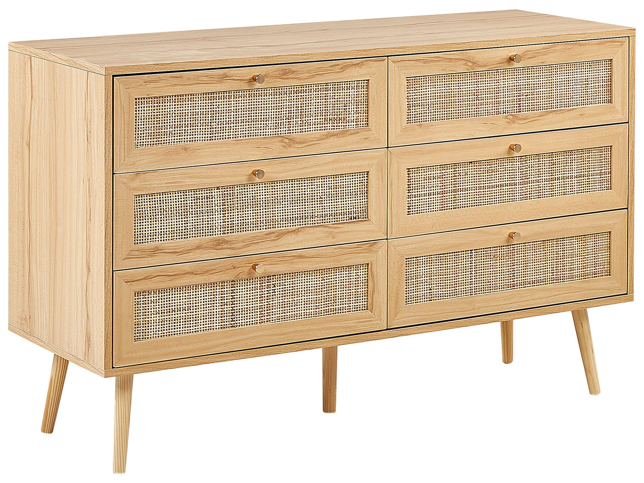 Chiffonnier. Cette commode est un ajout moderne et peu encombrant à tout salon, couloir ou chambre à coucher. Dotée de six tiroirs, elle offre un vaste espace de rangement pour les livres, les documents, le linge supplémentaire ainsi qu'un emplacement pour les pièces de décoration sur son plateau. Son ton bois clair universel est apaisant, tandis que les façades en rotin tressé offrent un style bohème. Le corps est fabriqué en panneaux de particules et en MDF, tandis que les pieds sont fabriqués en bois de pin et munis de capuchons de protection.
