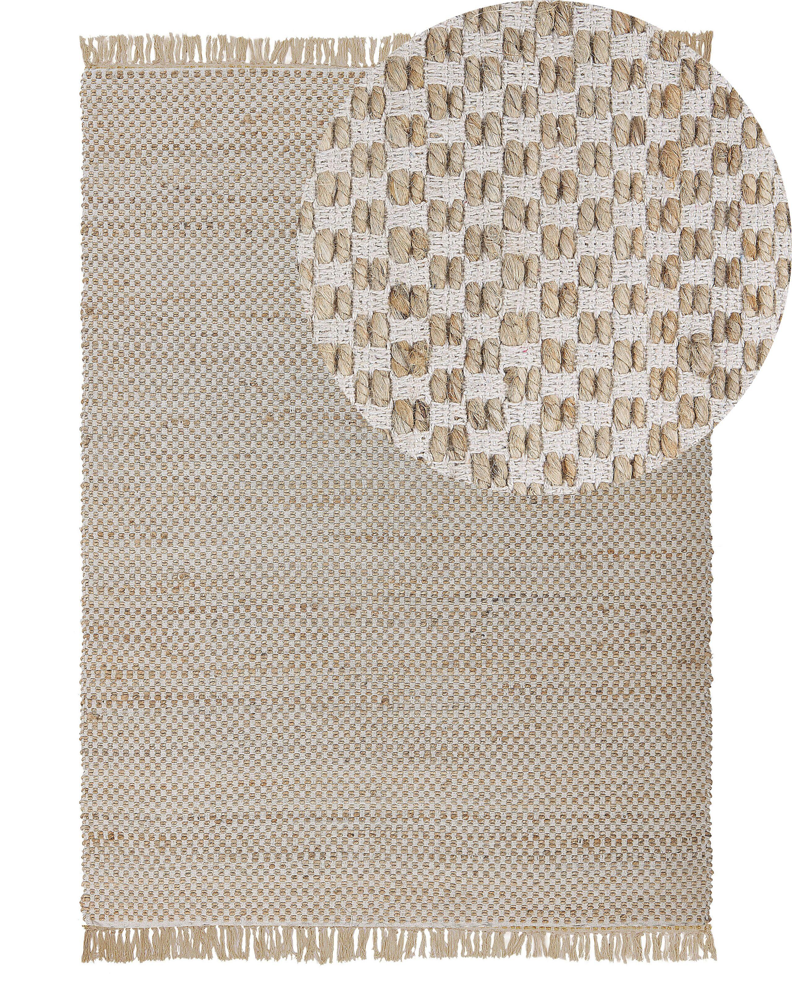 Tapis en jute et coton beige avec frange et motif carreaux. La fabrication grande qualité de ce tapis à poils ras le rend très solide et idéal pour les zones de passage. Les longues franges et la couleur beige diffusent une ambiance particulièrement chaleureuse et bohème. Ce modèle conviendra parfaitement à une chambre boho ou à un salon cosy, où le confort et une atmosphère de bien-être sont importants.