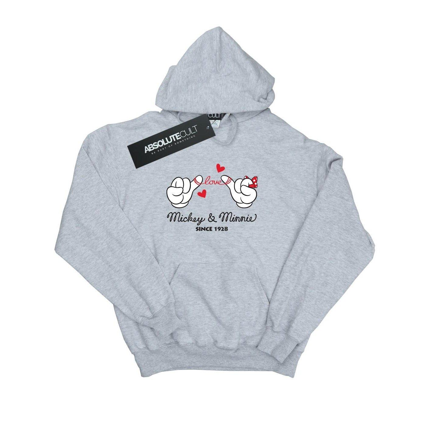 Ce sweat à capuche présente un charmant graphique des mains de Mickey et Minnie Mouse formant un cœur, avec les mots "love" et "Mickey & Minnie Since 1928" imprimés en dessous. C'est un choix confortable et élégant pour les fans du duo emblématique de Disney.