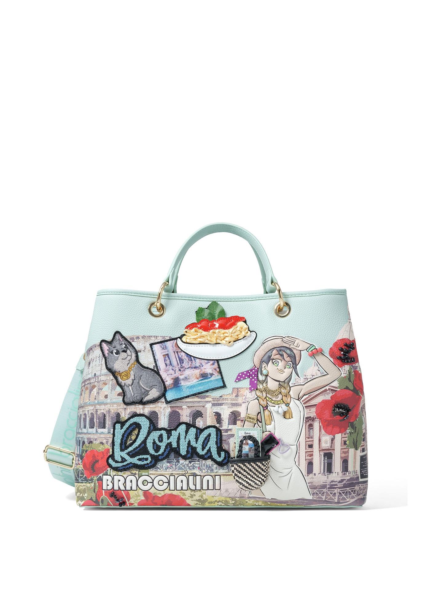 Ce sac à main présente un design vibrant et détaillé inspiré de Rome, mettant en valeur des monuments emblématiques et des éléments ludiques. Le sac est équipé de poignées robustes et d'une bandoulière amovible pour des options de transport polyvalentes.
