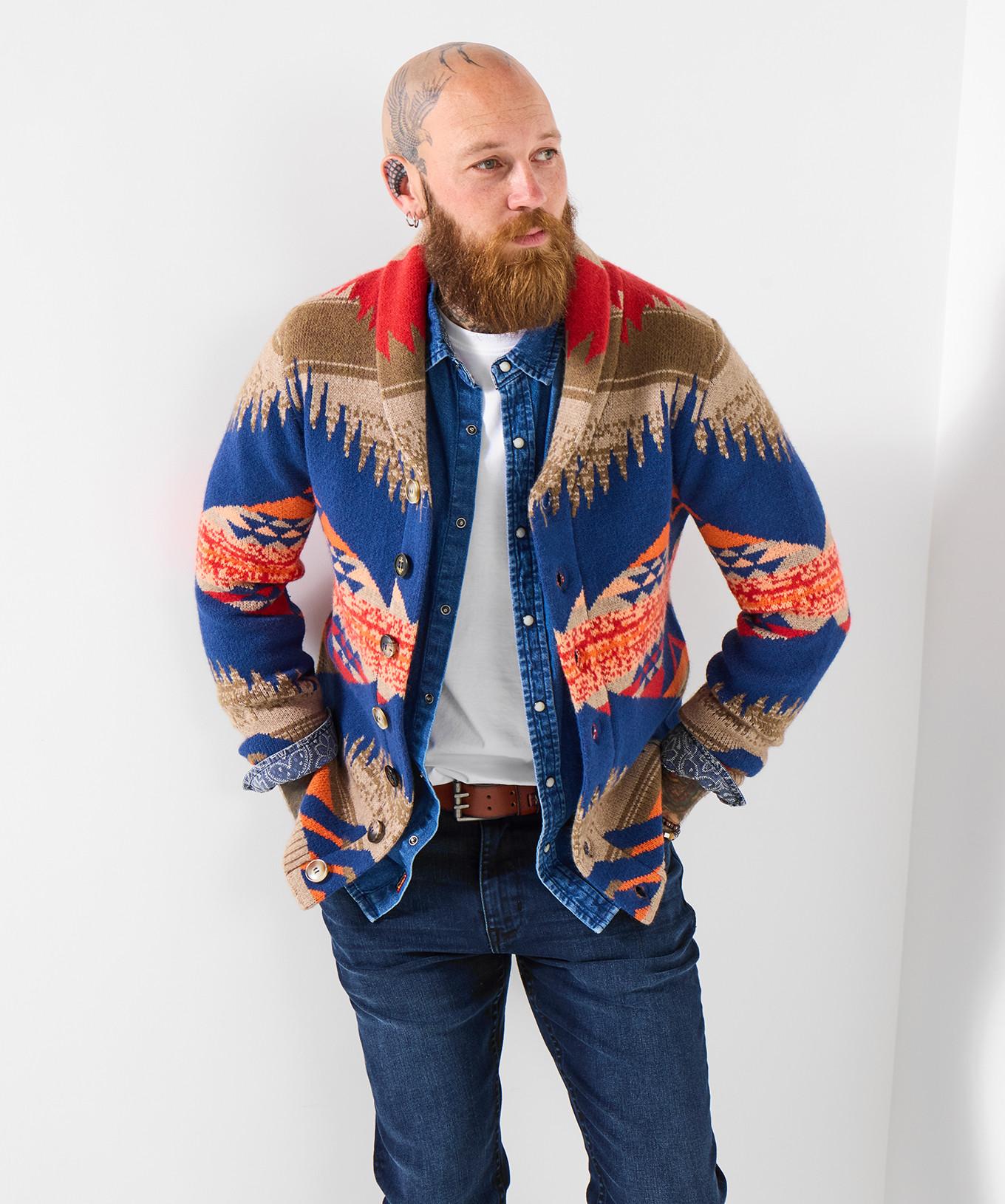 Ce cardigan arbore un motif aztèque distinctif, en faisant une pièce remarquable. Il est conçu avec un col châle classique, ajoutant une touche de style intemporel. La patte de boutonnage sur toute la longueur assure un port facile et une polyvalence, permettant de le porter ouvert ou fermé.