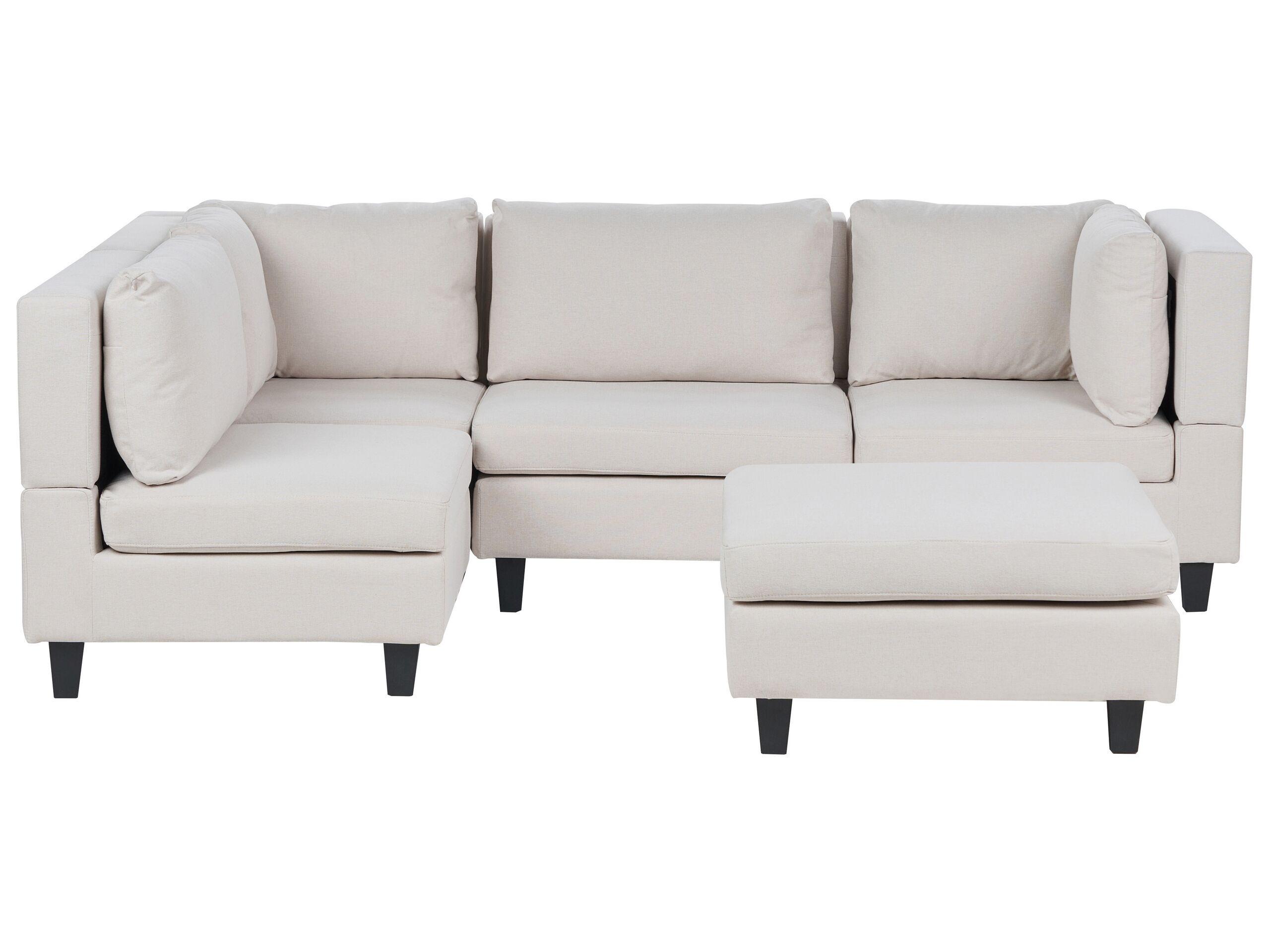 Canapé d'angle modulaire rembourré avec ottoman. Ce canapé d'angle, conçu pour s'adapter à votre intérieur, est composé de quatre éléments modulables qui peuvent être facilement agencés. Les assises larges et profondes regroupées créent un grand espace confortable, idéal pour étendre ses jambes et se détendre pleinement. L'ensemble est équipé de pieds synthétiques noirs. Grâce à son revêtement en polyester rembourré de couleur neutre, le canapé s'adapte parfaitement à une grande variété de styles de décoration et de combinaisons de couleurs. L'ensemble est accompagné d'un pouf assorti de style ottoman.