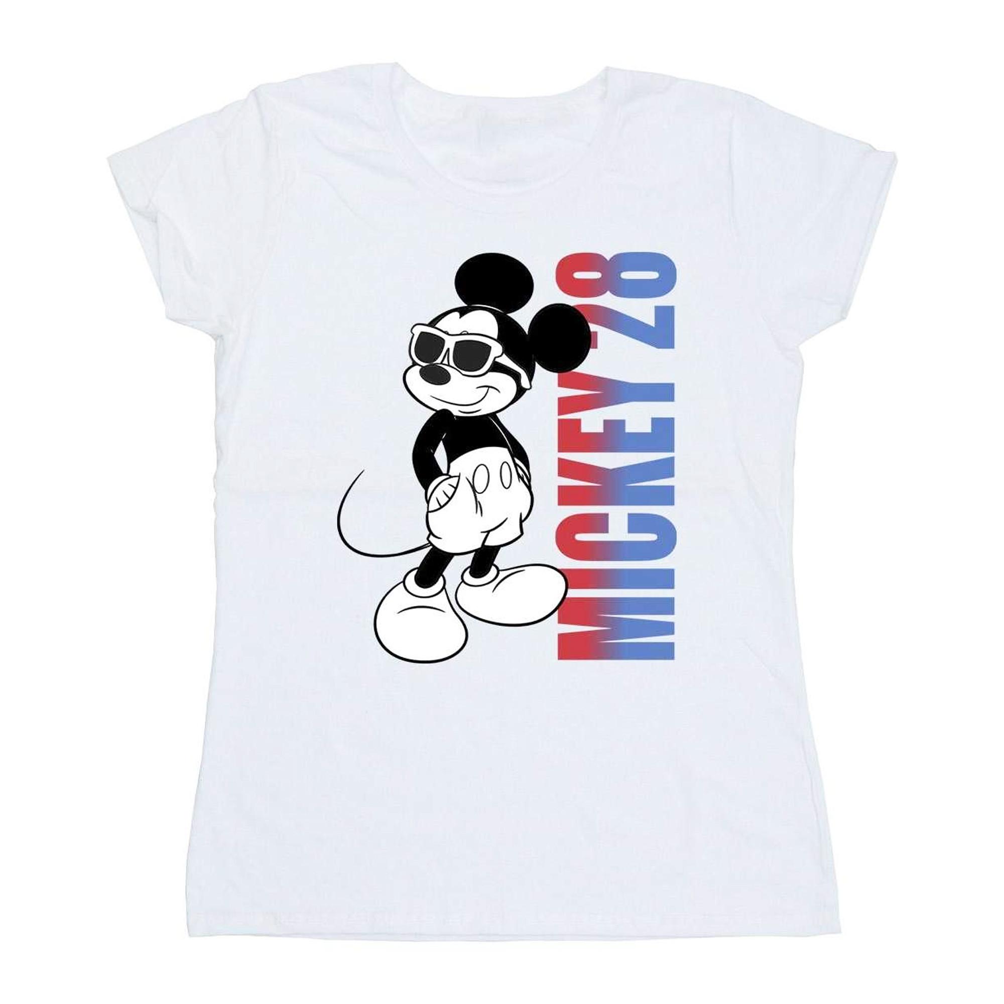 Ce t-shirt à manches courtes présente un imprimé graphique ludique de Mickey Mouse portant des lunettes de soleil, accompagné du texte « MICKEY 28 » dans un dégradé de rouge et de bleu. Le design classique à col rond en fait un ajout polyvalent à toute garde-robe décontractée.
