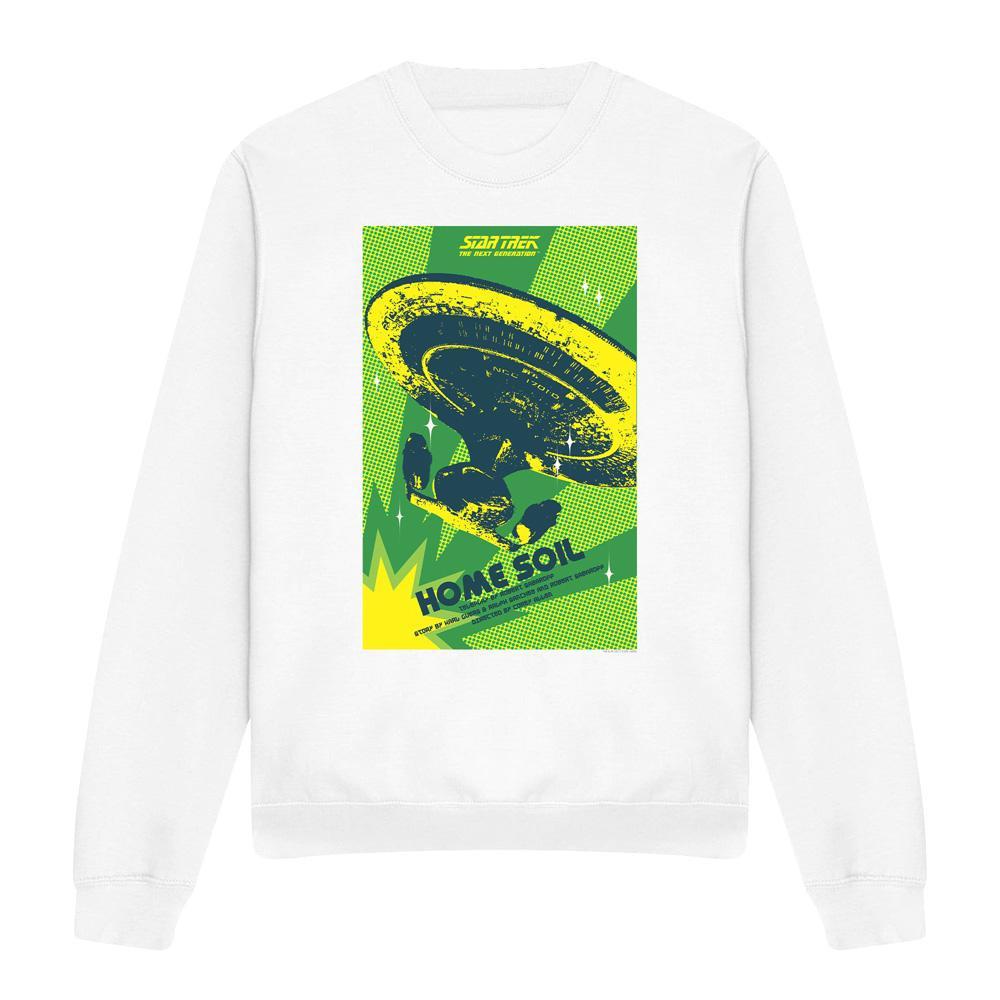 Ce sweatshirt présente un imprimé graphique inspiré de « Home Soil », saison 1, épisode 18 de Star Trek : The Next Generation. Le design met en valeur l'USS Enterprise D dans une illustration vibrante de style rétro, ce qui en fait une pièce distinctive pour les fans de la série.