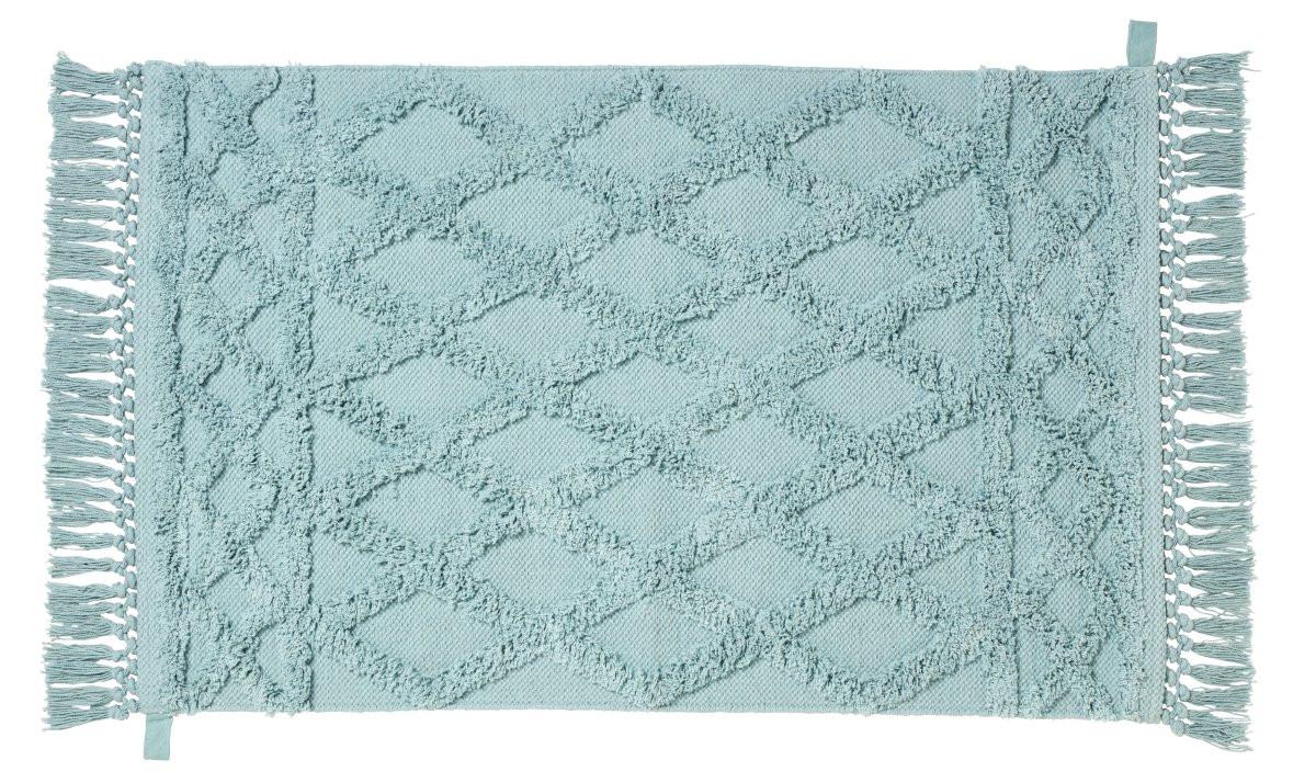 'diaqua® Tapis de Bain Kayla jade 60 X 90 CM 1.5 MM - Tapis de bain à la mode dans un look ethnique, fabriqué à partir de fibres naturelles de coton recyclé. Le matériel procure une sensation de bien-être lorsque l'on marche dessus et une isolation phonique grâce à la hauteur du poil moelleux. Le latex antidérapant sur la face inférieure rend ce tapis antidérapant. Ce tapis de bain est certifié selon l'OEKO-TEX Standard 100.'