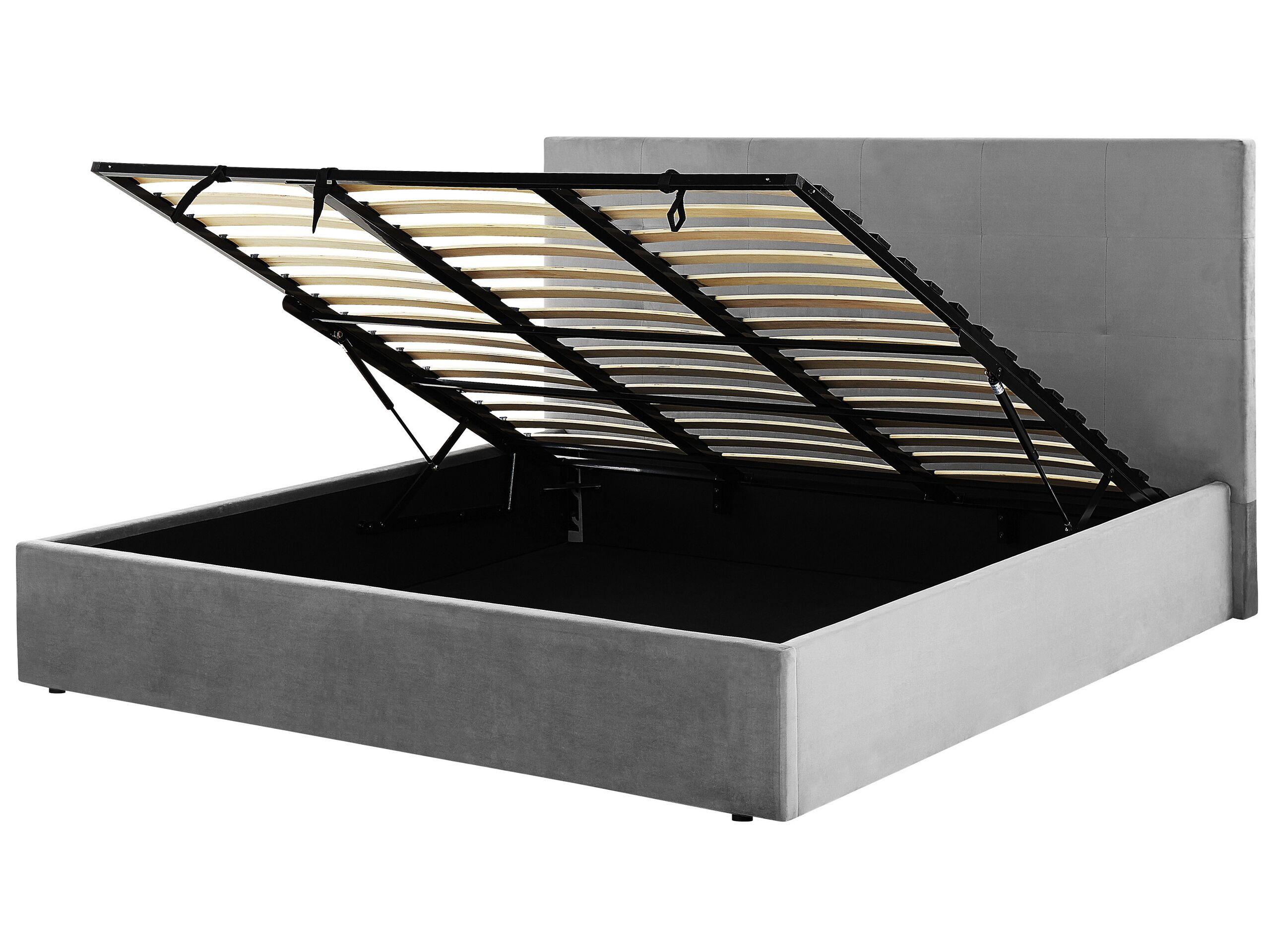 Lit avec rangement. Ce lit élégant donnera à votre chambre un aspect à la fois moderne et confortable, et contribuera à désencombrer l'espace. Son cadre est fabriqué dans un matériau durable et tapissé d'un tissu en velours doux au toucher. Le lit offre un espace de rangement supplémentaire sous le cadre à lattes, parfait pour les coussins et la literie. Grâce à ses lignes épurées, sa tête de lit rembourrée et sa couleur grise, vous pouvez facilement l'assortir à de nombreux styles de décoration.