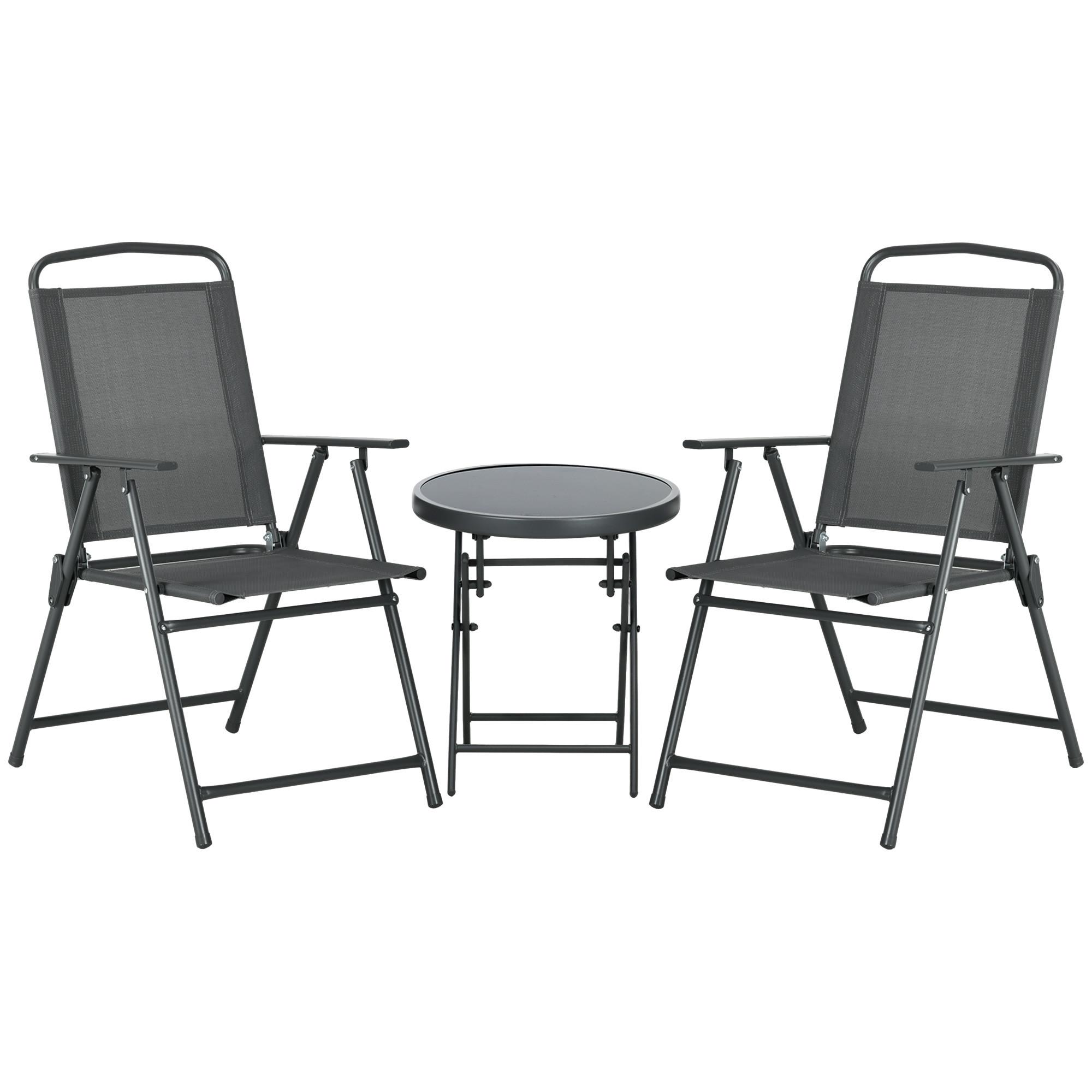 L'ensemble de salon de jardin trois pièces d'Outsunny se compose d'une table basse avec un plateau en verre trempé et de deux chaises pliantes avec accoudoirs. La table et les chaises de l'ensemble bistro sont constituées d'une structure en métal avec une surface enduite de poudre, ce qui les rend stables et robustes. Grâce à la conception pliable du mobilier de balcon, la table et les chaises peuvent être facilement rangées et transportées. Une façon idéale de profiter de la journée directement à votre porte avec Outsunny.