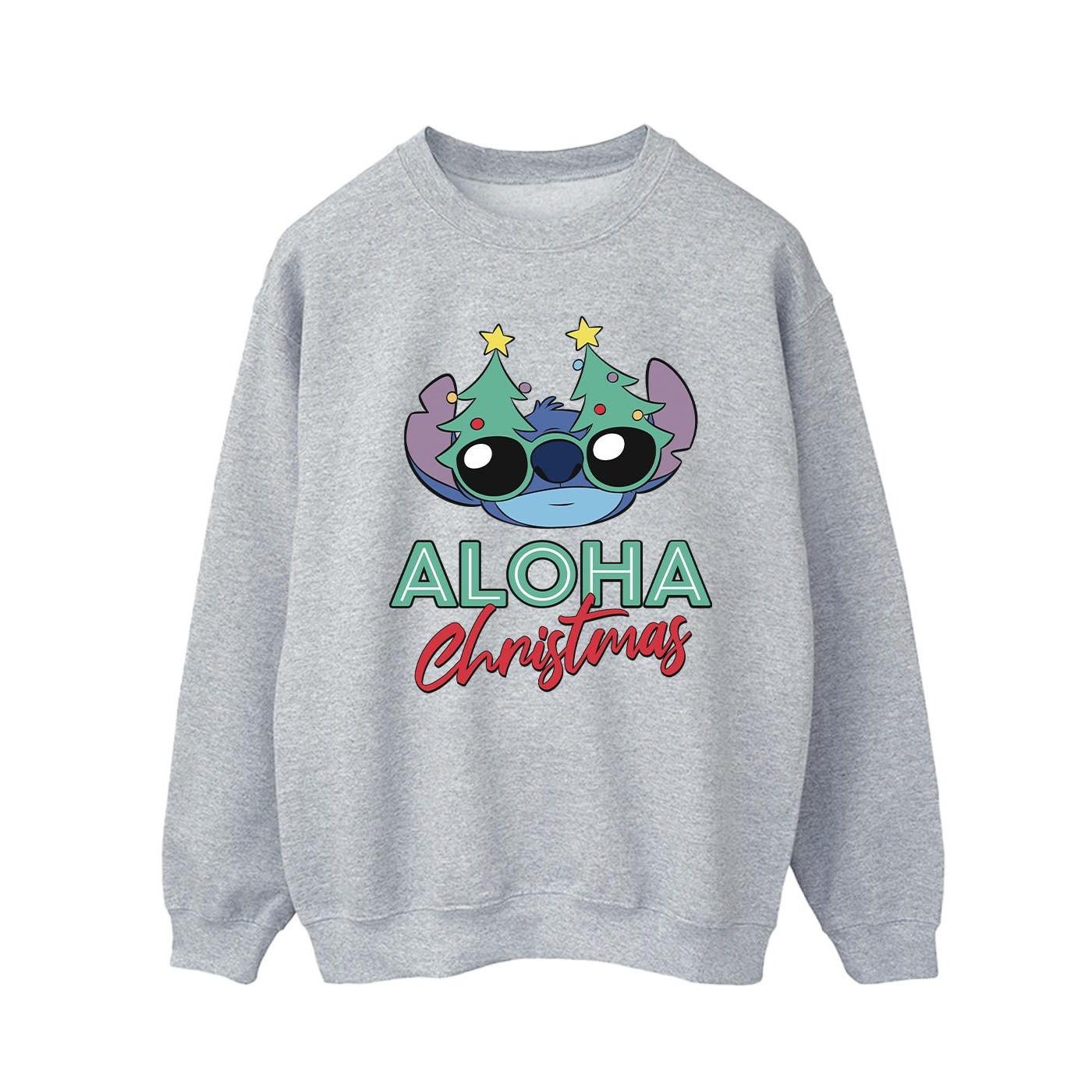 Ce sweat-shirt présente un motif festif avec Stitch portant des lunettes de soleil et des sapins de Noël sur la tête, accompagné du texte « ALOHA Christmas ». C'est une option confortable et élégante pour la saison des fêtes.