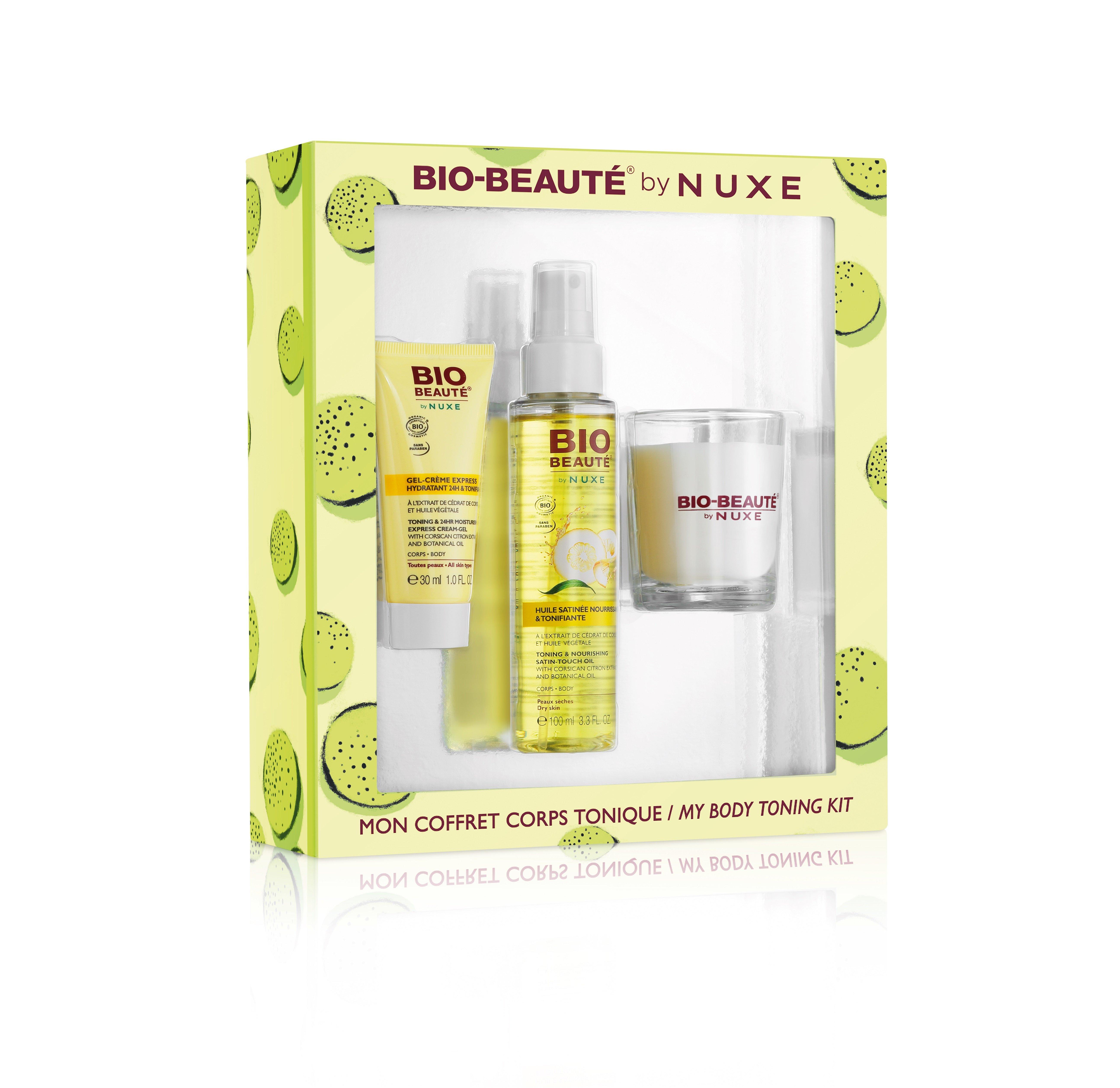 Le coffret contient une huile Satinée Nourrissante & Tonifiante, un Gel-Crème Express Hydratant 24h & Tonifiant (30ml) et une bougie cédrat (70g).