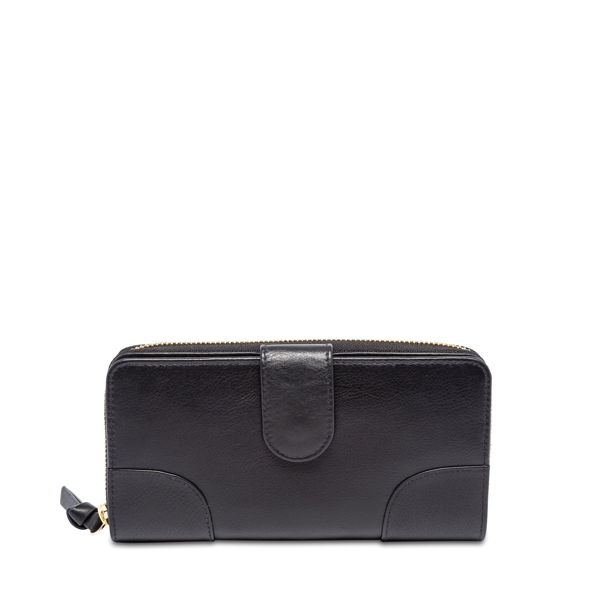 L'élégant porte-monnaie offre une division intelligente. Dans le compartiment zippé, il y a un compartiment à monnaie et diverses poches pour cartes et billets. Dans le compartiment à bouton-pression, il y a différentes poches avec une fenêtre transparente pour les cartes et deux larges poches.
