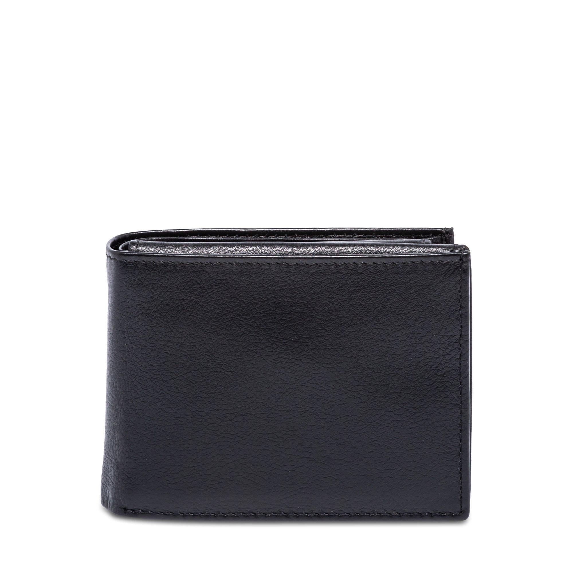 Le portefeuille simple offre diverses poches à l'intérieur pour les cartes et les billets. Un côté avec des compartiments ouverts peut être ouvert vers le haut pour révéler encore plus de poches. Le grand compartiment à monnaie a une fermeture à pression.