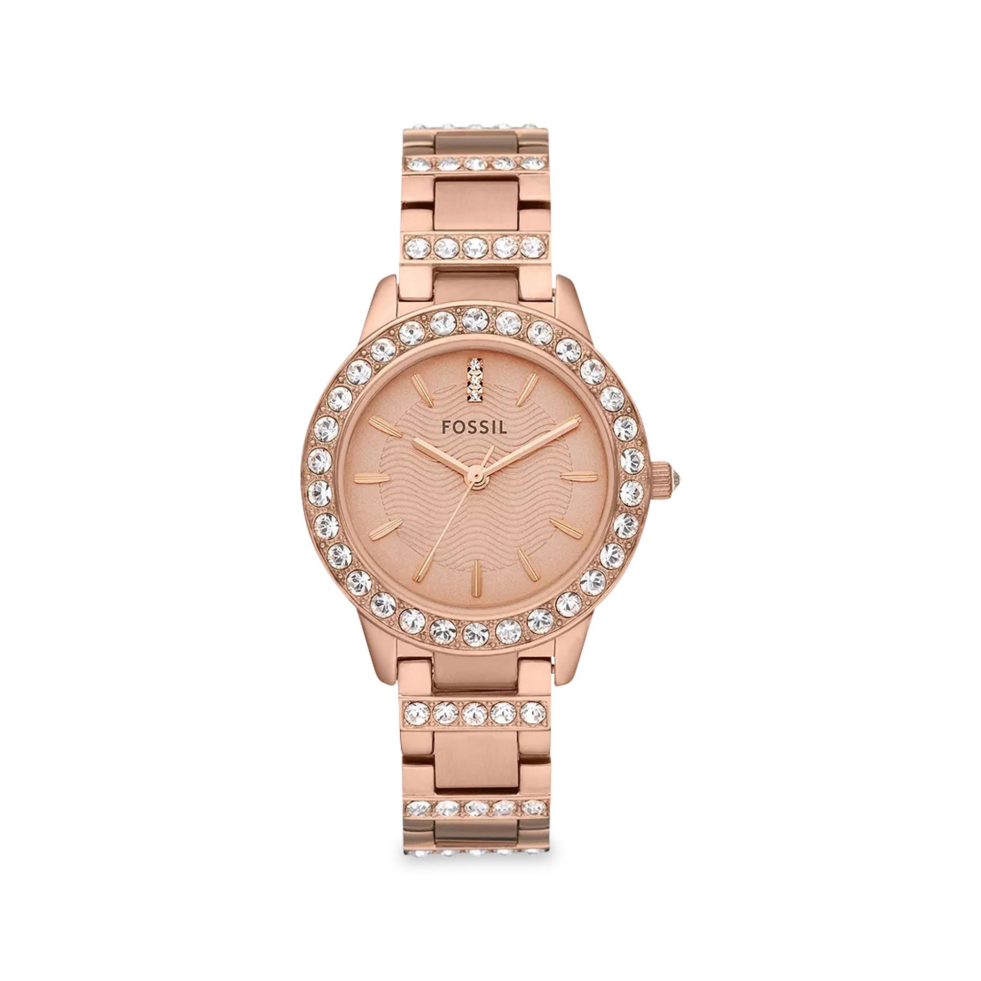 Une pluie d'étincelles en pierres facettées définit le design de cette montre analogique de haute qualité de la marque Fossil.