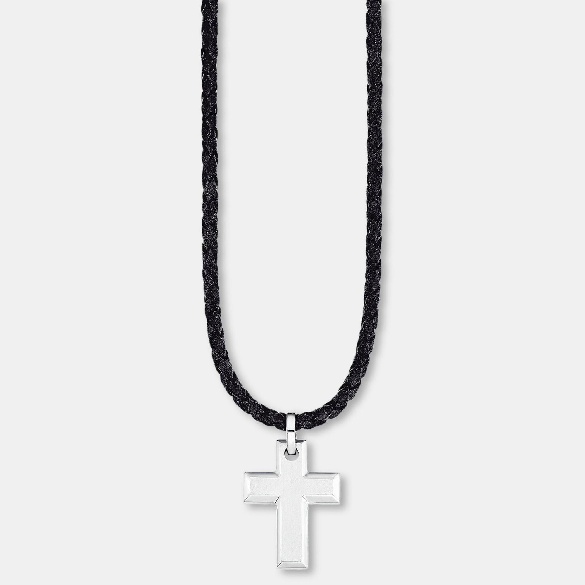 Cette chaîne à la mode comporte un pendentif brillant et mat en forme de croix. La chaîne est en cuir noir tressé. Le pendentif et la fermeture sont en acier inoxydable robuste. La chaîne peut être rallongée grâce à une chaîne d'extension de 47 cm à 50 cm.