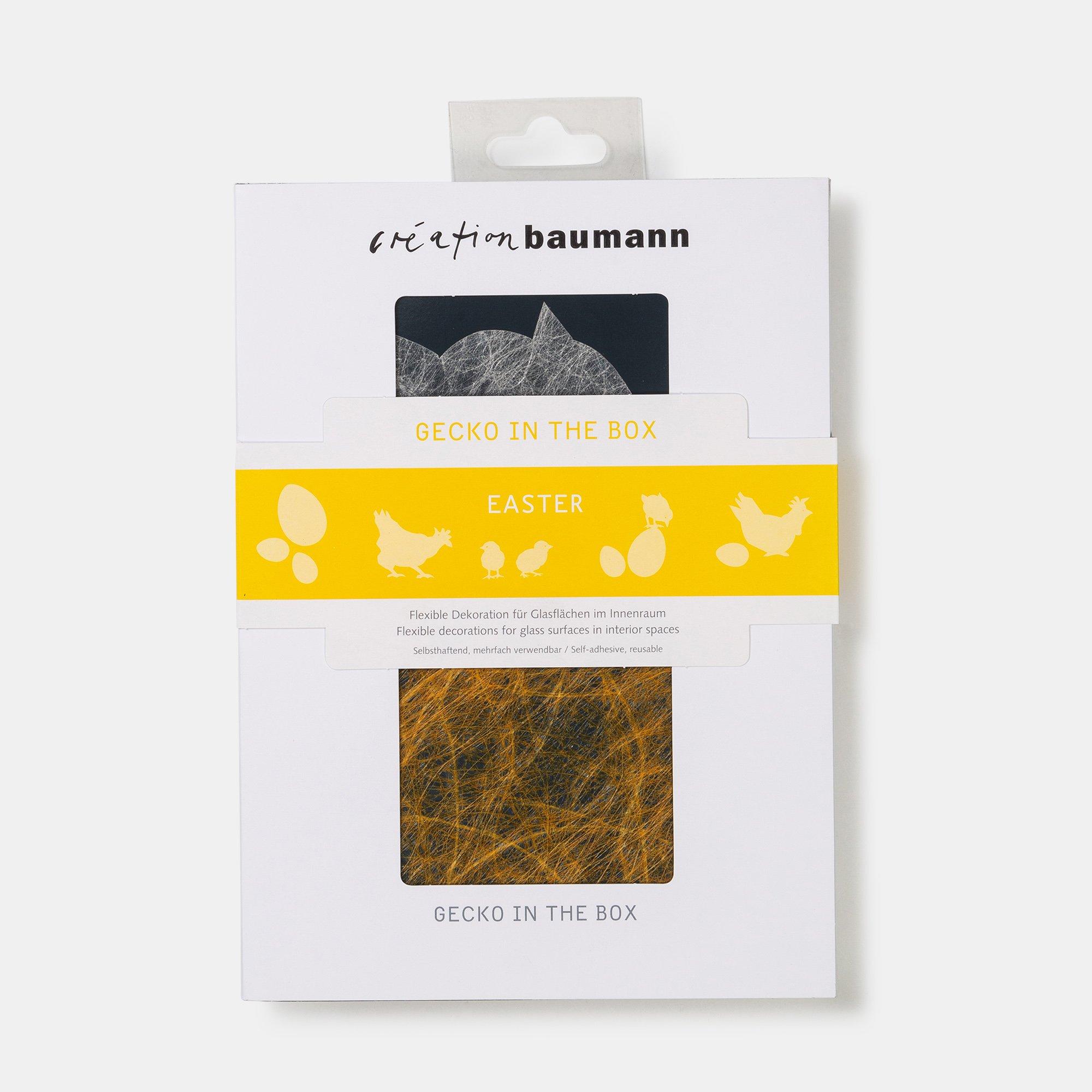 GECKO IN THE BOX : décoration flexible pour surfaces en verre à l'intérieur. Le textile adhésif de haute qualité de Création Baumann est idéal pour la saison de Pâques. Les textiles adhésifs sont auto-adhésifs et réutilisables. Décorez votre maison de façon créative avec ces motifs de Pâques.