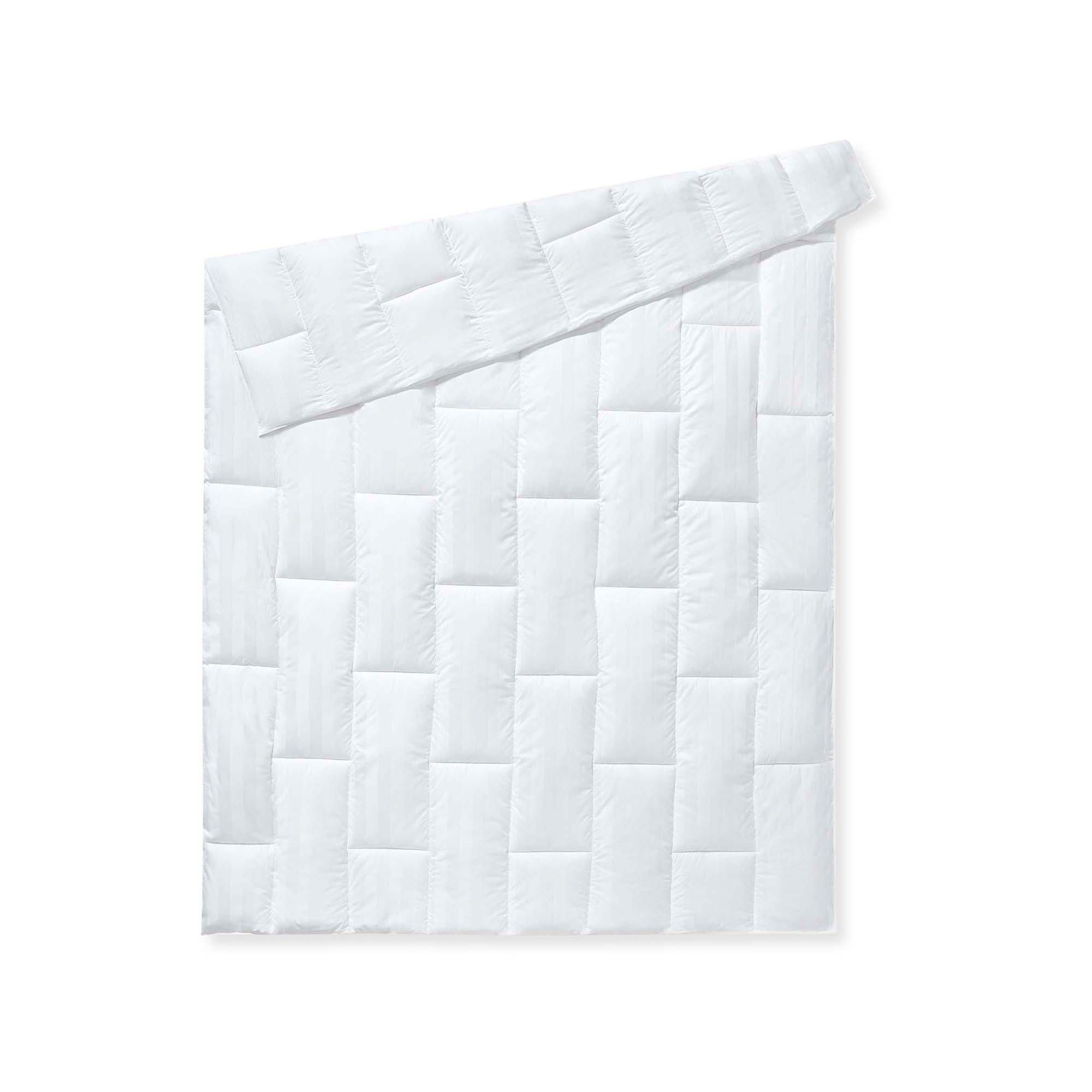 La couette en duvet toute saison Premium garantit aux dormeurs ayant un besoin en chaleur moyen, une qualité particulièrement élevée et assure le meilleur équilibre thermique possible. Le remplissage en pures plumes d'oies extra moelleuses assure un transport d'humidité équilibré. Le duvet est composé de satin jacquard rayé élégant avec un piquage douillet. Avec lui, on dort profondément.