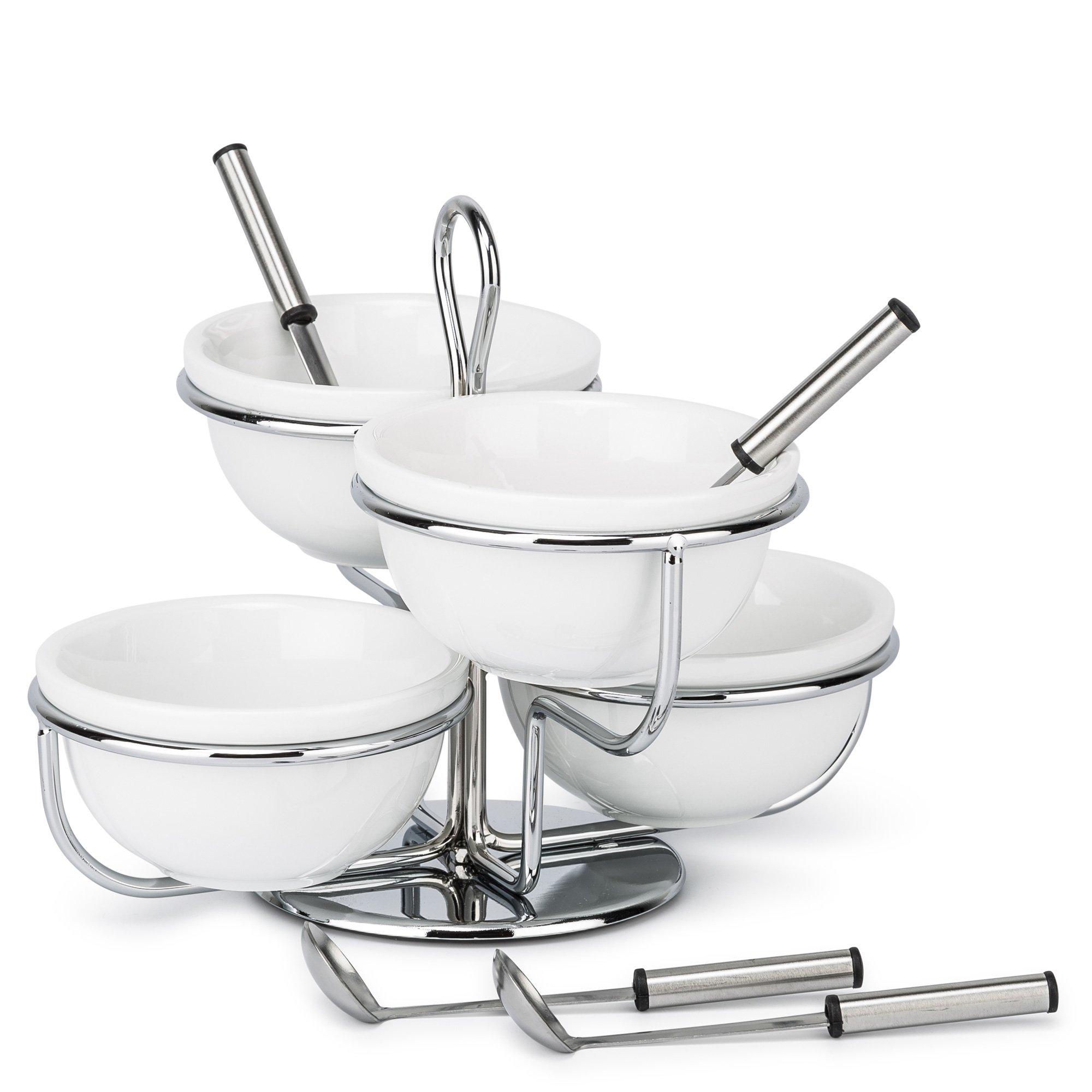 L'ensemble de saucières Gourmande est un complément idéal à la fondue. Le support rotatif accepte jusqu'à quatre petits bols dans lesquels vous pouvez présenter des sauces et des accompagnements. Quatre cuillères complètent l'ensemble. Pour réussir dans votre soirée fondue en famille ou entre amis.
