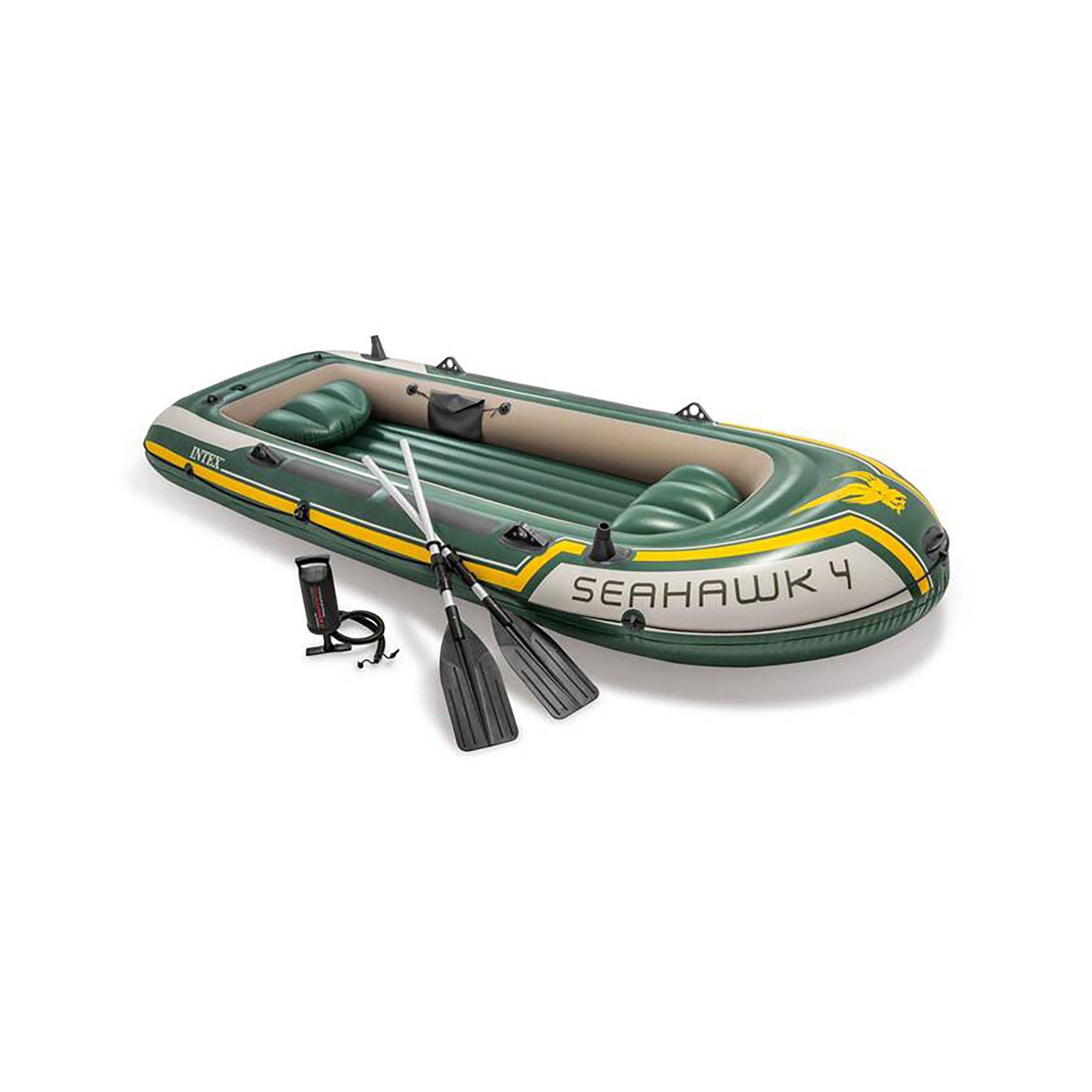 Avec le bateau pneumatique Seahawk 4 de la marque Intex, vous ferez l'expérience d'excursions passionnantes sur l'eau. Le bateau en caoutchouc de couleur verte offre de la place pour jusqu'à quatre personnes et il est livré en ensemble pratique qui comprend, en plus du bateau pneumatique, deux pagaies et une pompe manuelle. Seahawk 4 se compose de trois chambres à air, y compris une chambre intérieure dans la coque pour les situations d'urgence et il est fabriqué en matériau "Super-Tough" ultra-solide à trois couches qui garantit une grande durabilité et une résistance à l'abrasion, aux rayons UV, à l'huile et l'eau de mer. Grâce aux deux valves Boston dans les chambres à air principales, le bateau pneumatique peut être rapidement gonflé et dégonflé. Deux coussins à gonflage aussi rapide, les quatre supports pour les pagaies avec des dames de nage mobiles, une corde polyvalente pratique, des poignées de maintien et deux supports pour cannes à pêche montés complètent l'ensemble.
