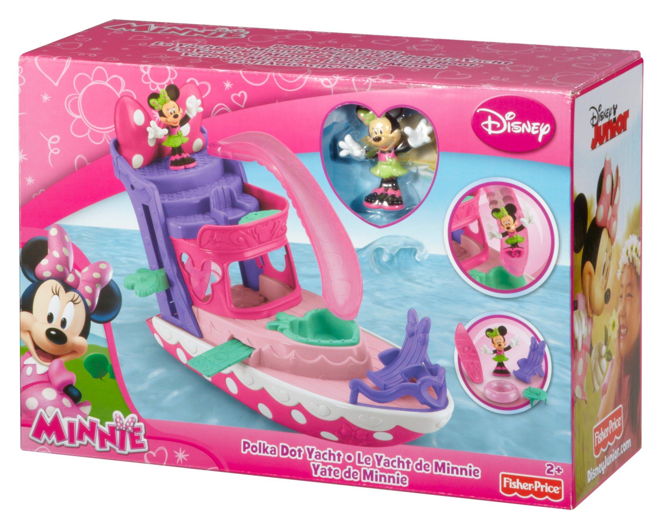 Quelle meilleure façon de se déplacer dans les zones tropicales que sur le Yacht de Minnie ! Découvrez les fonctionnalités amusantes de ce yacht. Navigue depuis le balcon, saute dans le toboggan pour arriver directement dans la piscine en forme de coeur, sert toi du plongeoir pour sauter directement dans l'océan et reprend l'ascenseur pour remonter sur le pont. Comprend une figurine Minnie, une table, une chaise longue, une planche de surf et une bouée.