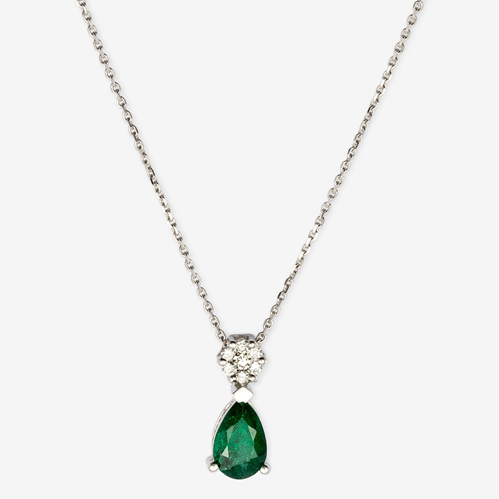 Ce collier en or blanc fin 585 comprend un pendentif avec huit diamants sertis en cercle et une émeraude en forme de goutte avec un poids total de 0,52 carat. Le bijou est sécurisé par un fermoir à mousqueton.