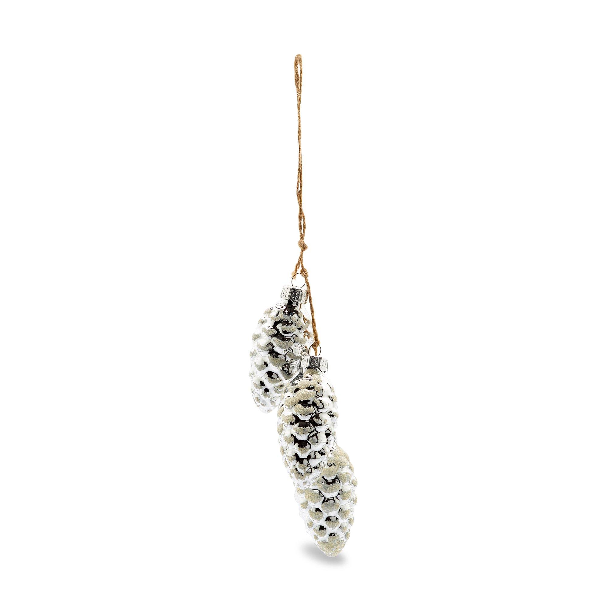 Superbes suspensions en pomme de pin pour le sapin de Noël. Elles sont fabriquées en verre véritable et saupoudrées de neige artificielle.